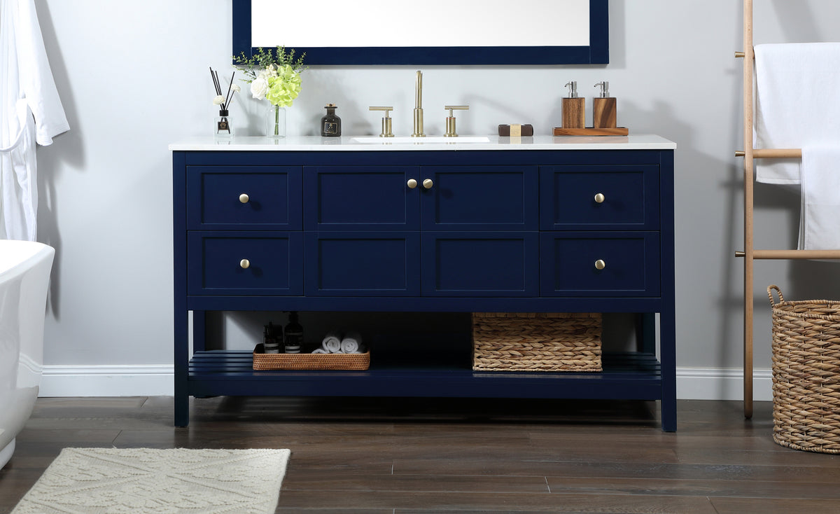 The subtle beauty of the Theo collection vanity exudes comfortable luxury. Its modern, yet traditional beauty will surely dress up your bathroom or powder room without any fuss. The calacatta engineered marble countertop and porcelain undermount sink shows quiet opulence, and the legs support upright without fail. Brushed gold hardware complements the trendy blue finish, with pulls adorning the two cabinet doors, showcasing ample storage space within. Slated shelf allows for additional space to organize your towels. Whether this vanity is in your bathroom or for guests, its presence will surely elevate the aesthetics of your room.