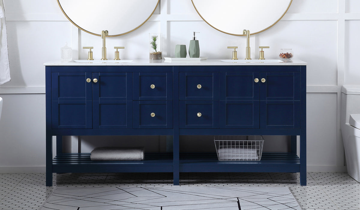 The subtle beauty of the Theo collection 72" vanity in a blue finish exudes comfortable luxury. Its modern, yet traditional beauty will surely dress up your bathroom or powder room without any fuss. The white stone countertop and porcelain undermount sink shows quiet opulence, and the legs support upright without fail. Gold hardware complements the trendy blue finish, with pulls adorning the four cabinet doors and four drawers, showcasing ample storage space within. Slated shelf allows for additional space to organize your towels. Whether this vanity is in your bathroom or for guests, its presence will surely elevate the aesthetics of your room.