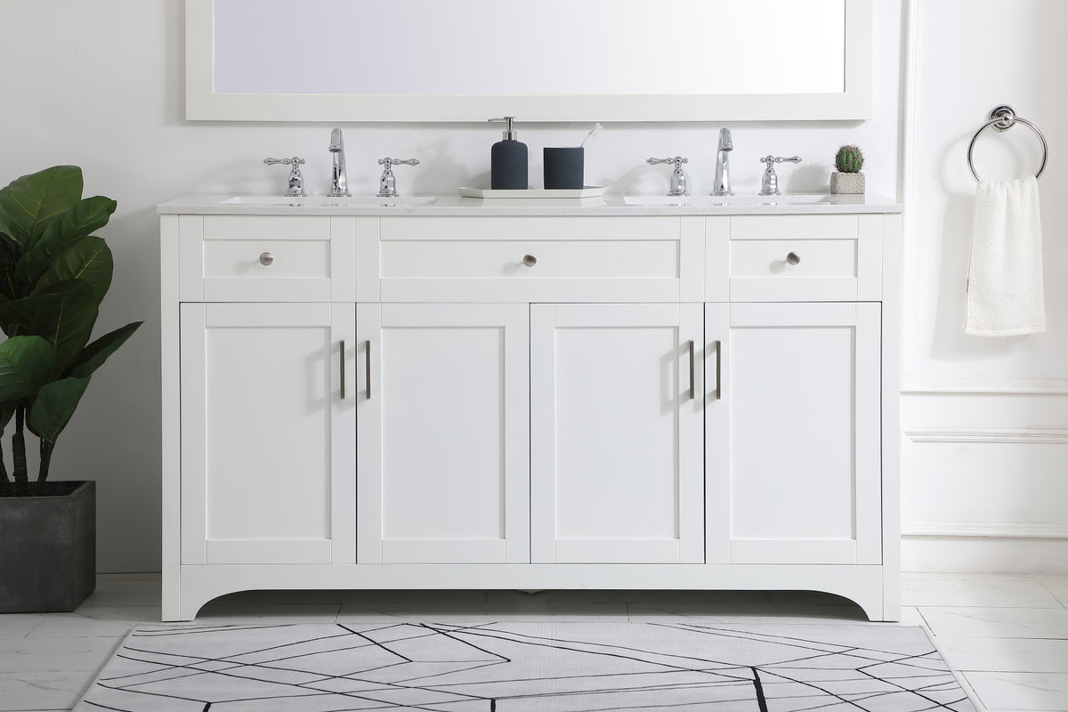 The refined simplicity of this 60" white finish vanity creates a peaceful, yet stylish, atmosphere. Its traditional modernity adds a mature beauty that will elevate any bathroom or powder room--the Calacatta engineered marble counter top with double porcelain sinks add refined luxe while the brushed nickel handle bars open the 4 cabinet doors, revealing ample storage space to store and hide away an assortment of bathroom essentials. Whether your home is large or small, this vanity will surely fit in well.