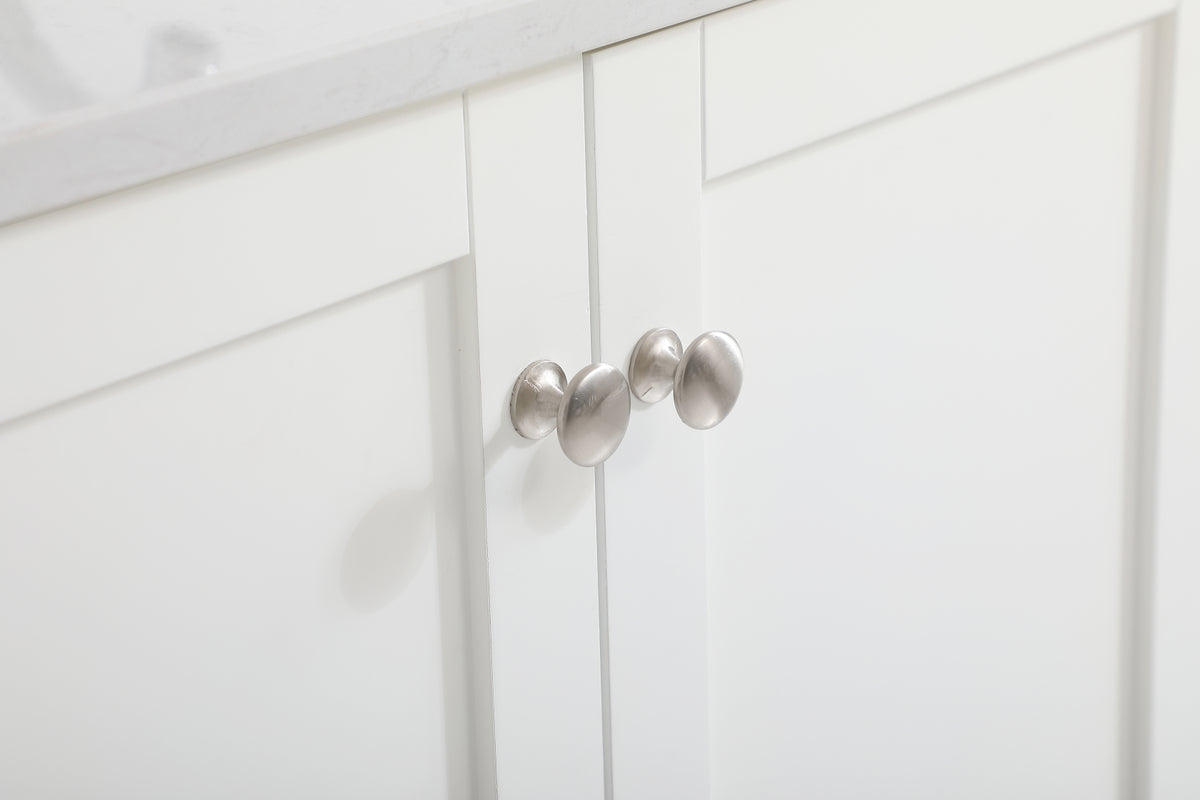While unassuming, this 42" vanity in a white finish sure knows how to redefine luxury. The sleek brushed nickel knobs adorn the double cabinet doors and 3 drawers which allow you to store your bathroom toiletries and necessities. Standing strong on oblique legs and dressed with a Calacatta engineered marble countertop, this vanity will surely create beauty and casual elegance in your bathroom or powder room.