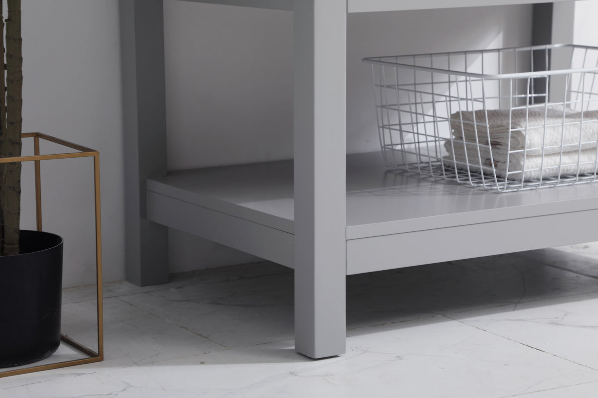 Make the most of your space with this 30" traditional style bathroom vanity. Its traditional style is able to complement many aesthetics with its grey finish, Calacatta engineered marble countertop, and the contemporary slender brushed nickel handle bar that sits on the two u-shaped drawers, allowing you to store an assortment of bathroom essentials. The lower shelf makes it the perfect space to hold new towels for your guests. This compact vanity ensures both form and function in your bathroom or powder room for you and your guests.