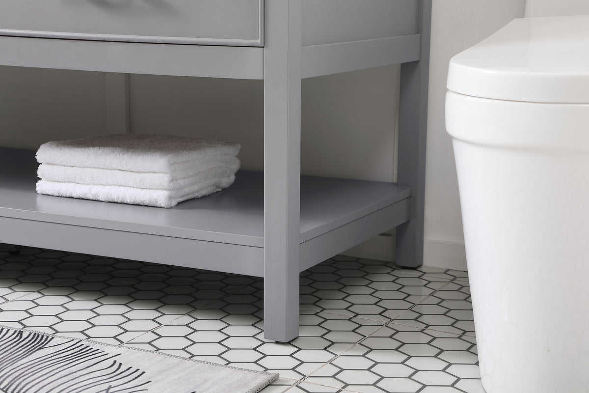 Make the most of your space with this traditional style bathroom vanity. Complements well with many aesthetics with its beautiful finish, calacatta engineered marble countertop, and the contemporary slender handle bar that sits on six functional drawers with soft closing mechanism, allowing you to store an assortment of bathroom essentials. The lower shelf makes it the perfect space to hold new towels for your guests. This compact vanity ensures both form and function in your bathroom or powder room for you and your guests.
