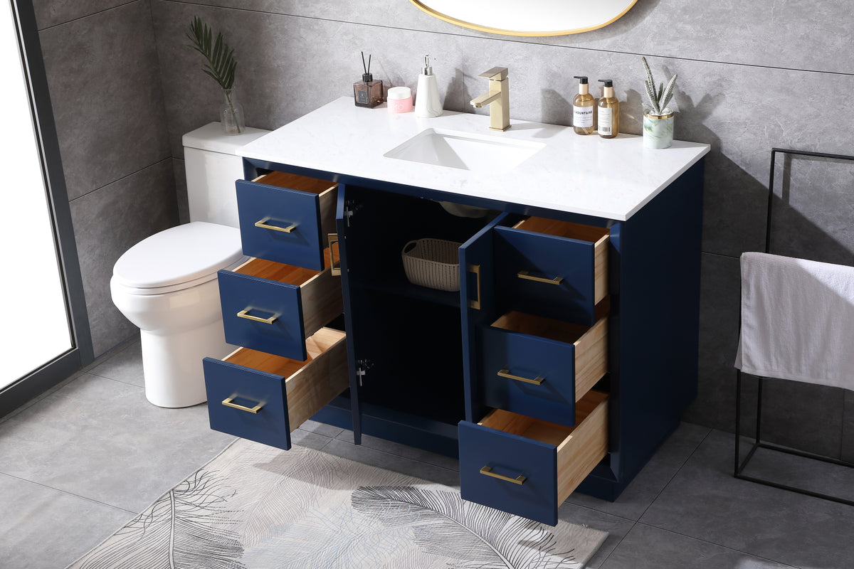 Step into a realm of modern luxury with our freestanding bathroom vanity, featuring a sleek and contemporary boxy design that sets new standards for aesthetics. The engineered marble countertop, with its crisp 0.75-inch straight edge, not only introduces sophistication but also ensures enduring durability. Convenience takes center stage with the undermount porcelain sink, measuring 15.35 inches long, 11 inches wide, and 7 inches deep, complemented by a single predrilled faucet hole for seamless installation. Experience the art of organization through soft-closing drawers and doors adorned with high-quality bar pulls, showcasing meticulous craftsmanship in the precision of butt joint drawers. The vanity, crafted from resilient MDF material, combines elegance with durability, supported by solid wood legs that provide stability and a touch of natural warmth. Elevate your bathroom with this distinctive piece, where the fusion of form and function creates a harmonious dance of modern sophistication, redefining your daily routine with a statement in style and practicality.