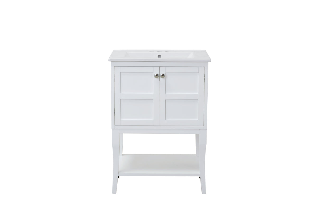 Designed with simple beauty and clean lines in mind , the Mason vanity will surely bring a unique flair to the modern day guest or office bathroom. Its transitional design features 2 framed doors with soft close function and an open shelf for your additional bathroom essential, topped with a modern white resin counter top with an integrated sink, which ensure non stain, scratch resistance and maintenance free use. the cabinet is painted in modern white, accented with round stainless steel door knobs, and build by solid wood frame, with graciously curved legs. FEATURES: *Mason collection *resin top with integrated sink *Measurements: W24xD18xH34” *Cabinet finish: white *4” spread ready to install faucet hole *2 doors and 1 shelf *Door knob finish: chrome *Build with solid wood and engineered wood. PRODUCTS DETAIL: *Top material: resin *Sink: resin *Base material:wood *Faucet: not included *Door included: 2 *Shelf: 1 *installation: required.