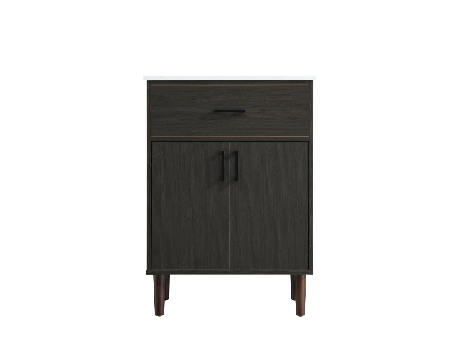 Transform your bathroom with this mid-century modern vanity, designed to bring both functionality and a sense of style to your space. Its clean lines, minimalist design, and tapered solid wood legs evoke a timeless charm, perfect for blending with modern and transitional interiors. The engineered marble countertop, with its unique faux marble veining, adds a refined, luxurious touch, while the porcelain sink is both durable and easy to maintain. Practicality meets aesthetics with a faux drawer for balanced design and a spacious double-door cabinet for efficient storage. Constructed from solid wood and MDF, this vanity offers lasting durability, while adjustable foot levelers ensure stability on any floor. Shipped mostly assembled, the solid wood legs can be effortlessly twisted into place, making installation quick and hassle-free.