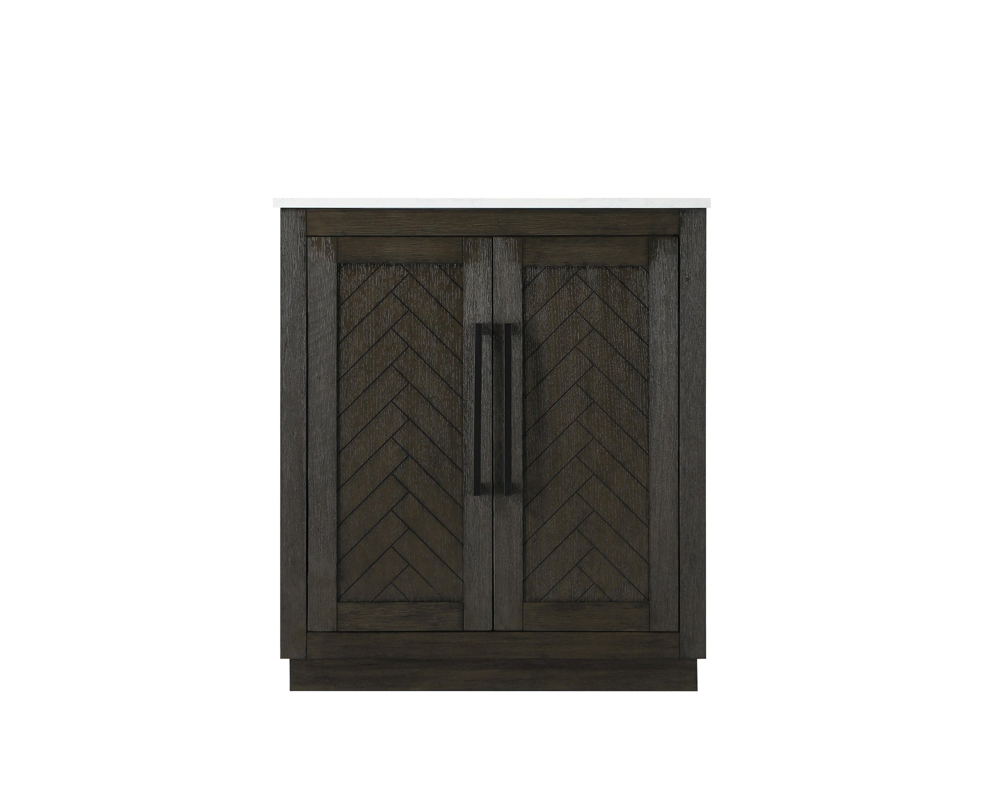 This transitional bathroom vanity offers the perfect blend of timeless style and modern functionality. Available in five refined finishes—crisp white, sleek grey, chocolate oak, honey oak, and linen oak—it complements a range of decor styles, from classic to contemporary. The stunning herringbone design on the Shaker-style door panels adds texture and craftsmanship to the piece. Topped with a white engineered marble countertop featuring subtle veining, it provides both beauty and durability. The long black metal pulls on the soft-closing doors add sleek, modern detailing. Practical features include a concealed overflow, a back panel cutout for easy plumbing installation, and a U-shaped cutout shelf to fit plumbing while maximizing storage space. With a toe kick all around the base, this vanity is thoughtfully designed to blend form and function in any bathroom setting.