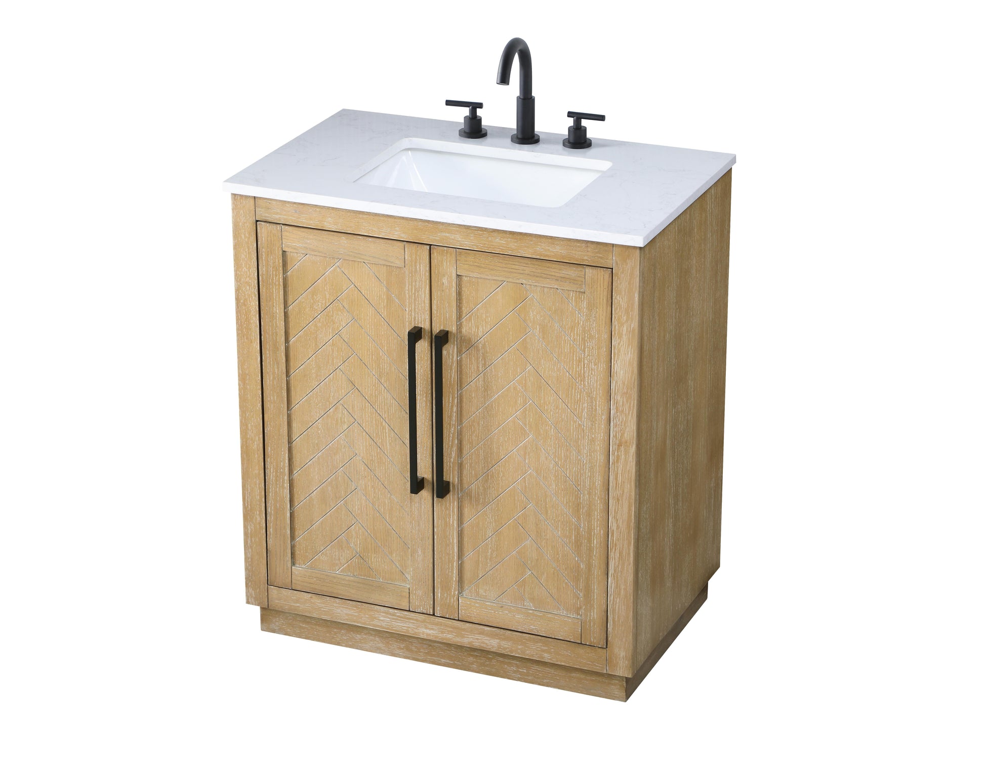 This transitional bathroom vanity offers the perfect blend of timeless style and modern functionality. Available in five refined finishes—crisp white, sleek grey, chocolate oak, honey oak, and linen oak—it complements a range of decor styles, from classic to contemporary. The stunning herringbone design on the Shaker-style door panels adds texture and craftsmanship to the piece. Topped with a white engineered marble countertop featuring subtle veining, it provides both beauty and durability. The long black metal pulls on the soft-closing doors add sleek, modern detailing. Practical features include a concealed overflow, a back panel cutout for easy plumbing installation, and a U-shaped cutout shelf to fit plumbing while maximizing storage space. With a toe kick all around the base, this vanity is thoughtfully designed to blend form and function in any bathroom setting.