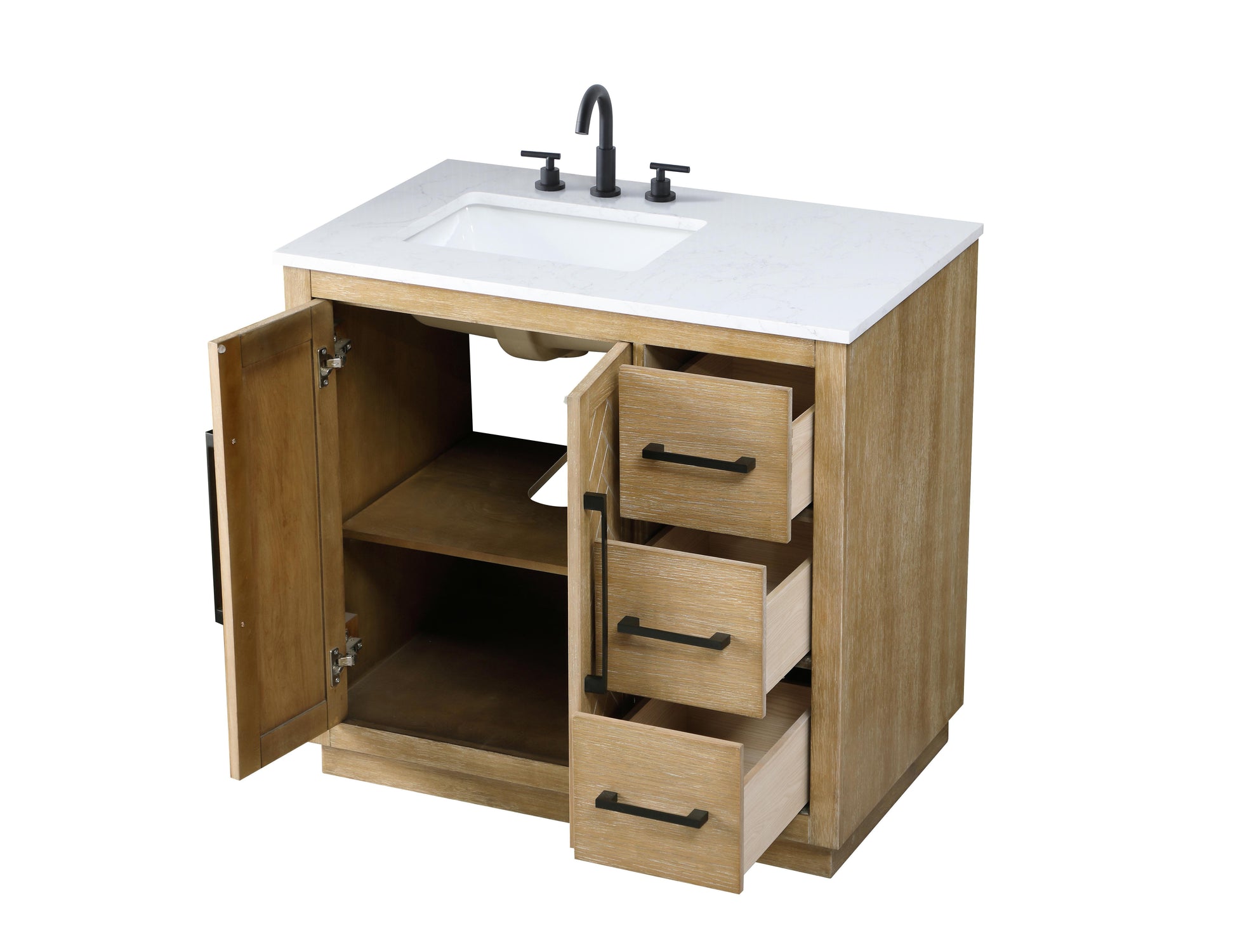 This transitional bathroom vanity offers the perfect blend of timeless style and modern functionality. Available in five refined finishes—crisp white, sleek grey, chocolate oak, honey oak, and linen oak—it complements a range of decor styles, from classic to contemporary. The stunning herringbone design on the Shaker-style door panels adds texture and craftsmanship to the piece. Topped with a white engineered marble countertop featuring subtle veining, it provides both beauty and durability. The long black metal pulls on the soft-closing doors and the thin bar pulls on the drawers add sleek, modern detailing. Practical features include a concealed overflow, a back panel cutout for easy plumbing installation, and a U-shaped cutout shelf to fit plumbing while maximizing storage space. With a toe kick all around the base, this vanity is thoughtfully designed to blend form and function in any bathroom setting.