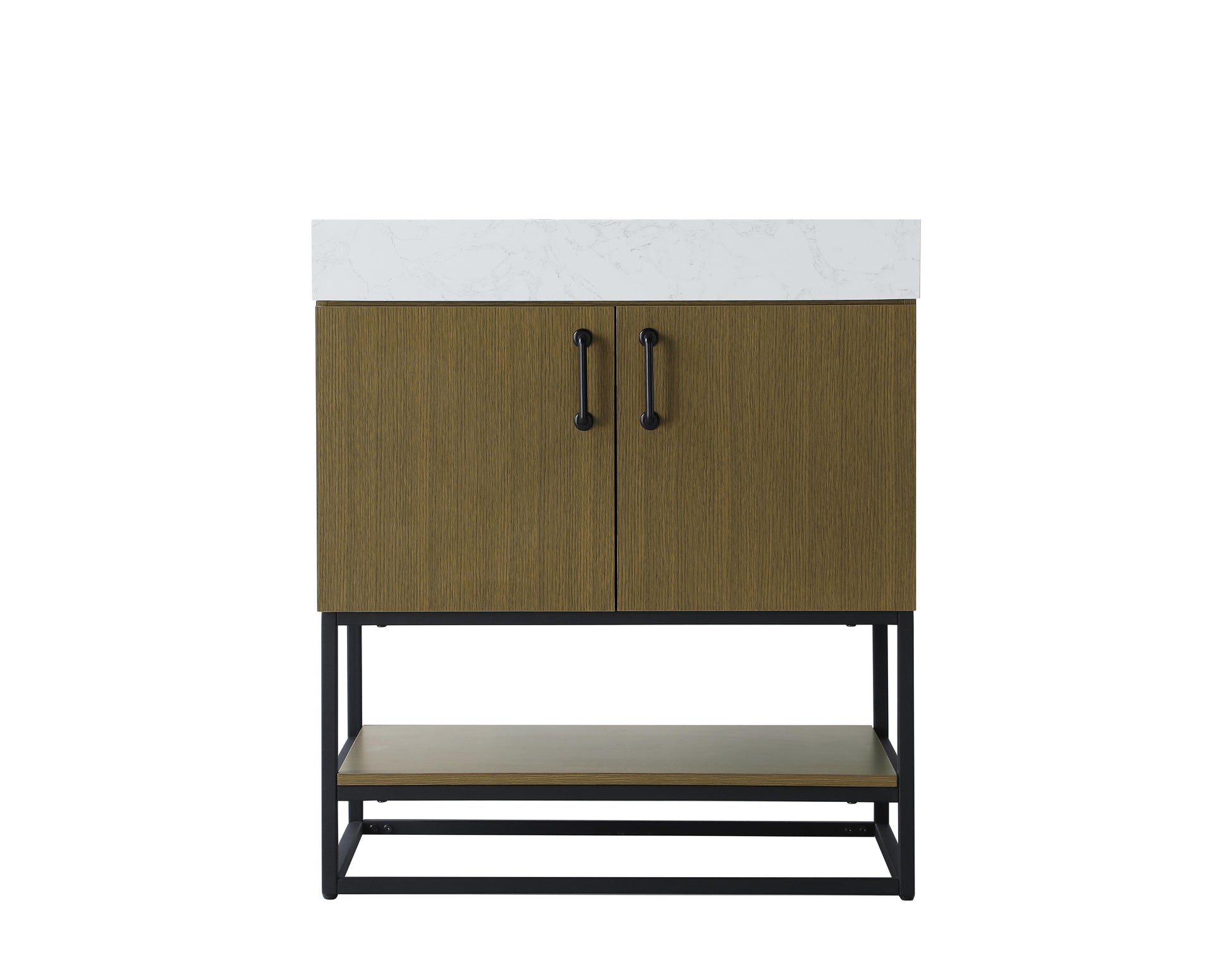 Upgrade your bathroom with this stylish transitional vanity, available in five stunning finishes, from crisp white to warm honey brown, designed to suit a variety of decor styles. The minimalist flat door panels and open wood shelf create a functional yet visually appealing storage solution, while the slender black metal legs elevate the look with modern sophistication. The 4-inch thick white engineered marble countertop, accented with natural veining, adds a luxurious touch, perfectly complemented by soft-closing doors with sleek black metal bar pulls. Thoughtful details like the concealed overflow, back panel cutout for plumbing, and 3 pre-drilled holes for an 8-inch faucet make installation easy and efficient. With a porcelain sink and farmhouse-inspired touches, this vanity brings both elegance and practicality to any bathroom setting.