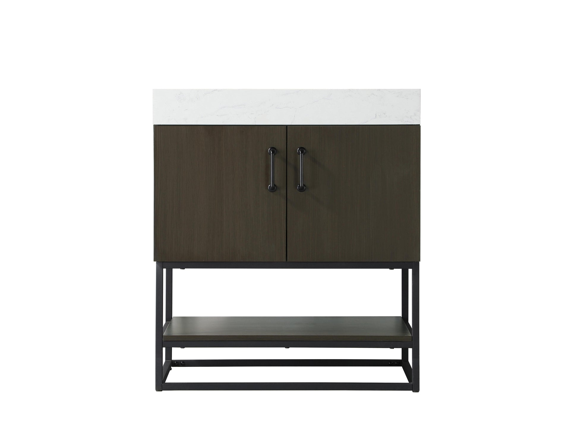 Upgrade your bathroom with this stylish transitional vanity, available in five stunning finishes, from crisp white to warm honey brown, designed to suit a variety of decor styles. The minimalist flat door panels and open wood shelf create a functional yet visually appealing storage solution, while the slender black metal legs elevate the look with modern sophistication. The 4-inch thick white engineered marble countertop, accented with natural veining, adds a luxurious touch, perfectly complemented by soft-closing doors with sleek black metal bar pulls. Thoughtful details like the concealed overflow, back panel cutout for plumbing, and 3 pre-drilled holes for an 8-inch faucet make installation easy and efficient. With a porcelain sink and farmhouse-inspired touches, this vanity brings both elegance and practicality to any bathroom setting.