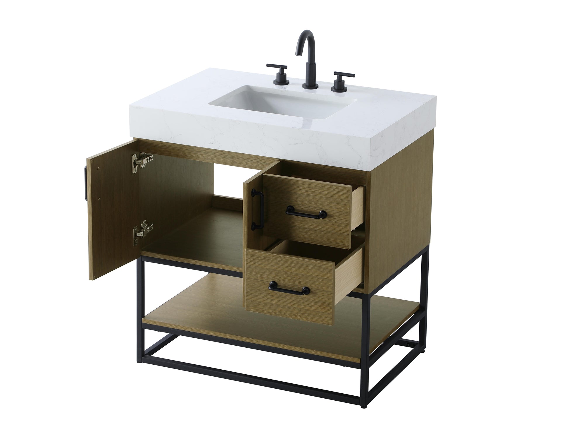 Upgrade your bathroom with this stylish transitional vanity, available in five stunning finishes, from crisp white to warm honey brown, designed to suit a variety of decor styles. The minimalist flat door panels and open wood shelf create a functional yet visually appealing storage solution, while the slender black metal legs elevate the look with modern sophistication. The 4-inch thick white engineered marble countertop, accented with natural veining, adds a luxurious touch, perfectly complemented by soft-closing doors with sleek black metal bar pulls. Thoughtful details like the concealed overflow, back panel cutout for plumbing, and 3 pre-drilled holes for an 8-inch faucet make installation easy and efficient. With a porcelain sink and farmhouse-inspired touches, this vanity brings both elegance and practicality to any bathroom setting.