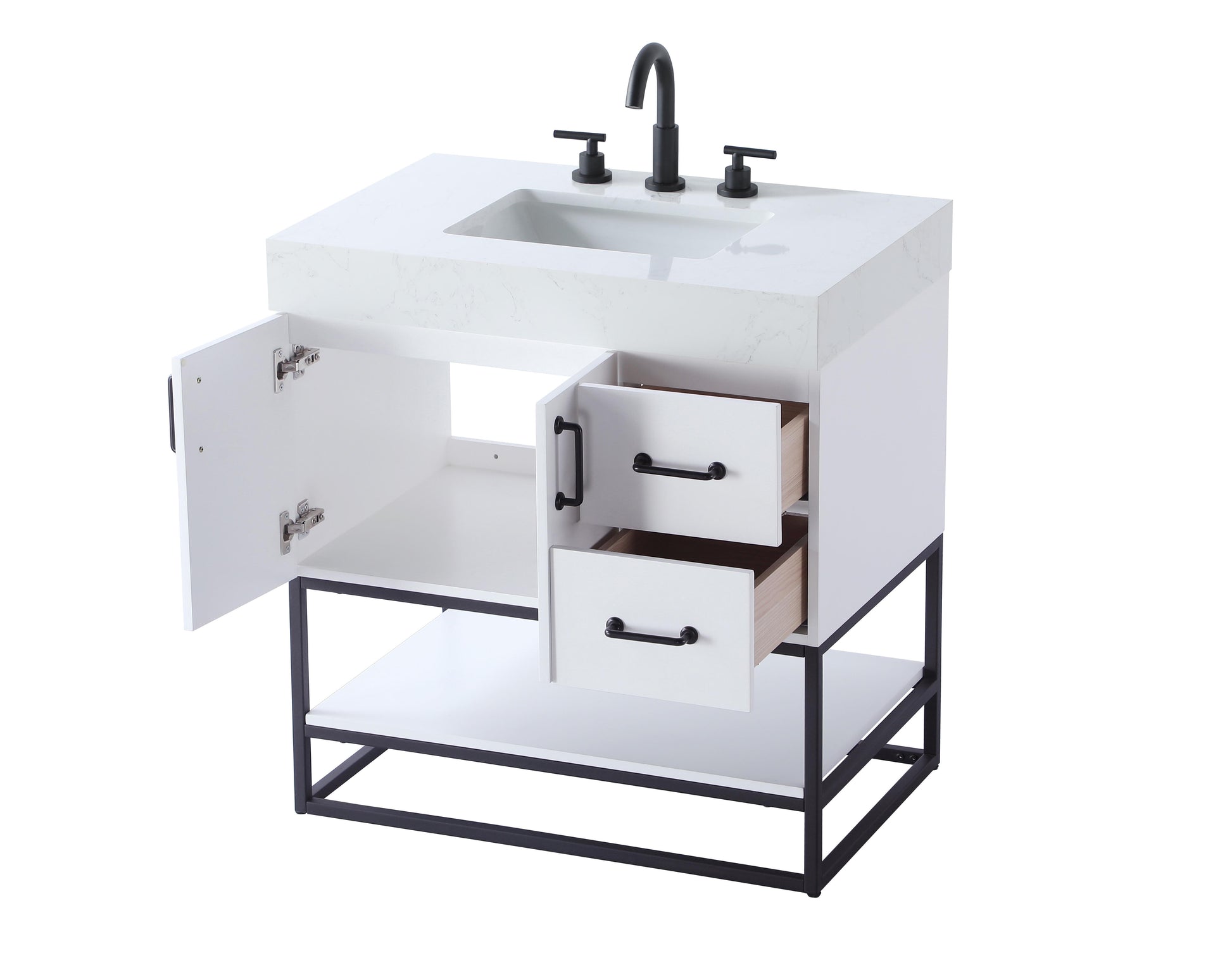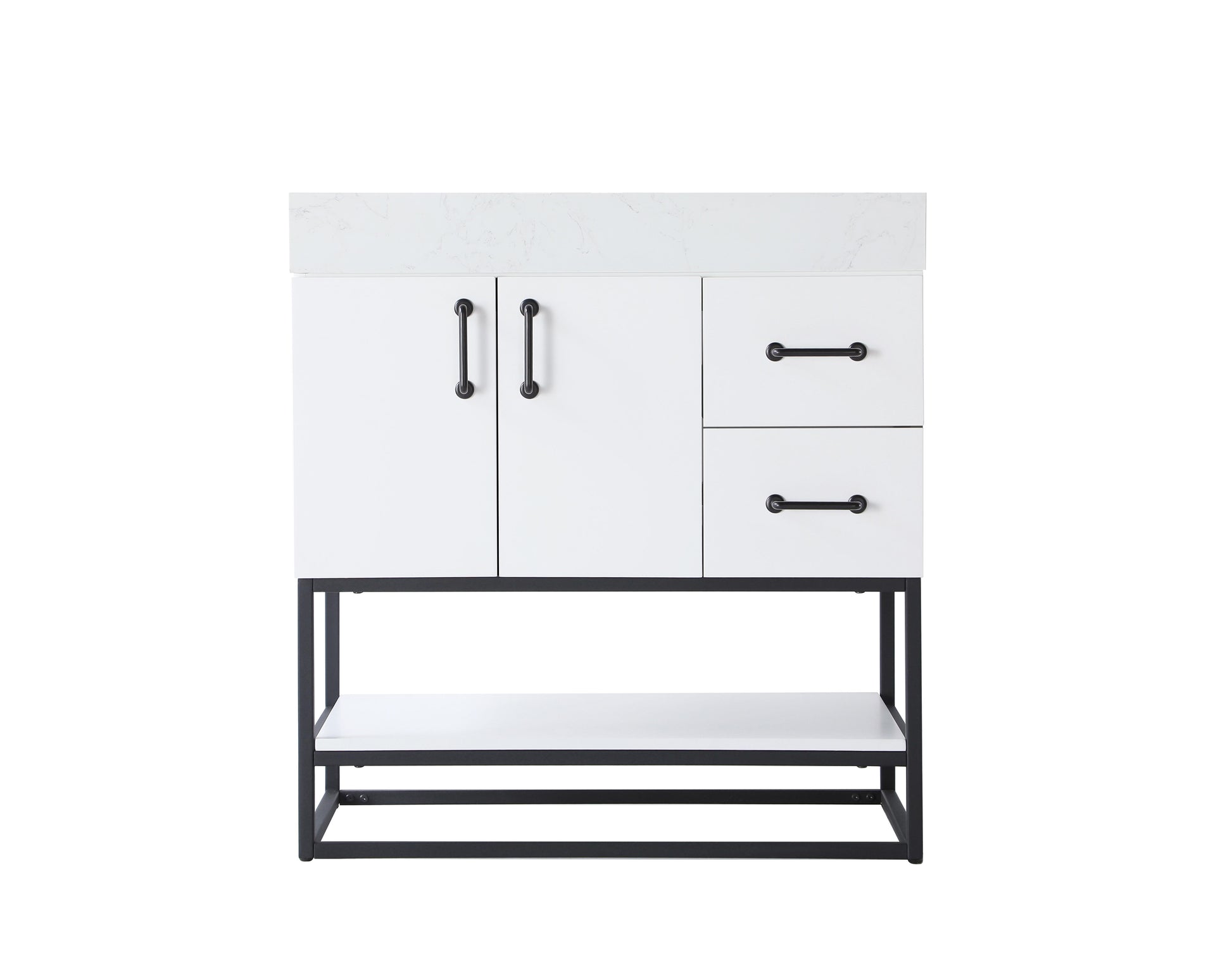 Upgrade your bathroom with this stylish transitional vanity, available in five stunning finishes, from crisp white to warm honey brown, designed to suit a variety of decor styles. The minimalist flat door panels and open wood shelf create a functional yet visually appealing storage solution, while the slender black metal legs elevate the look with modern sophistication. The 4-inch thick white engineered marble countertop, accented with natural veining, adds a luxurious touch, perfectly complemented by soft-closing doors with sleek black metal bar pulls. Thoughtful details like the concealed overflow, back panel cutout for plumbing, and 3 pre-drilled holes for an 8-inch faucet make installation easy and efficient. With a porcelain sink and farmhouse-inspired touches, this vanity brings both elegance and practicality to any bathroom setting.