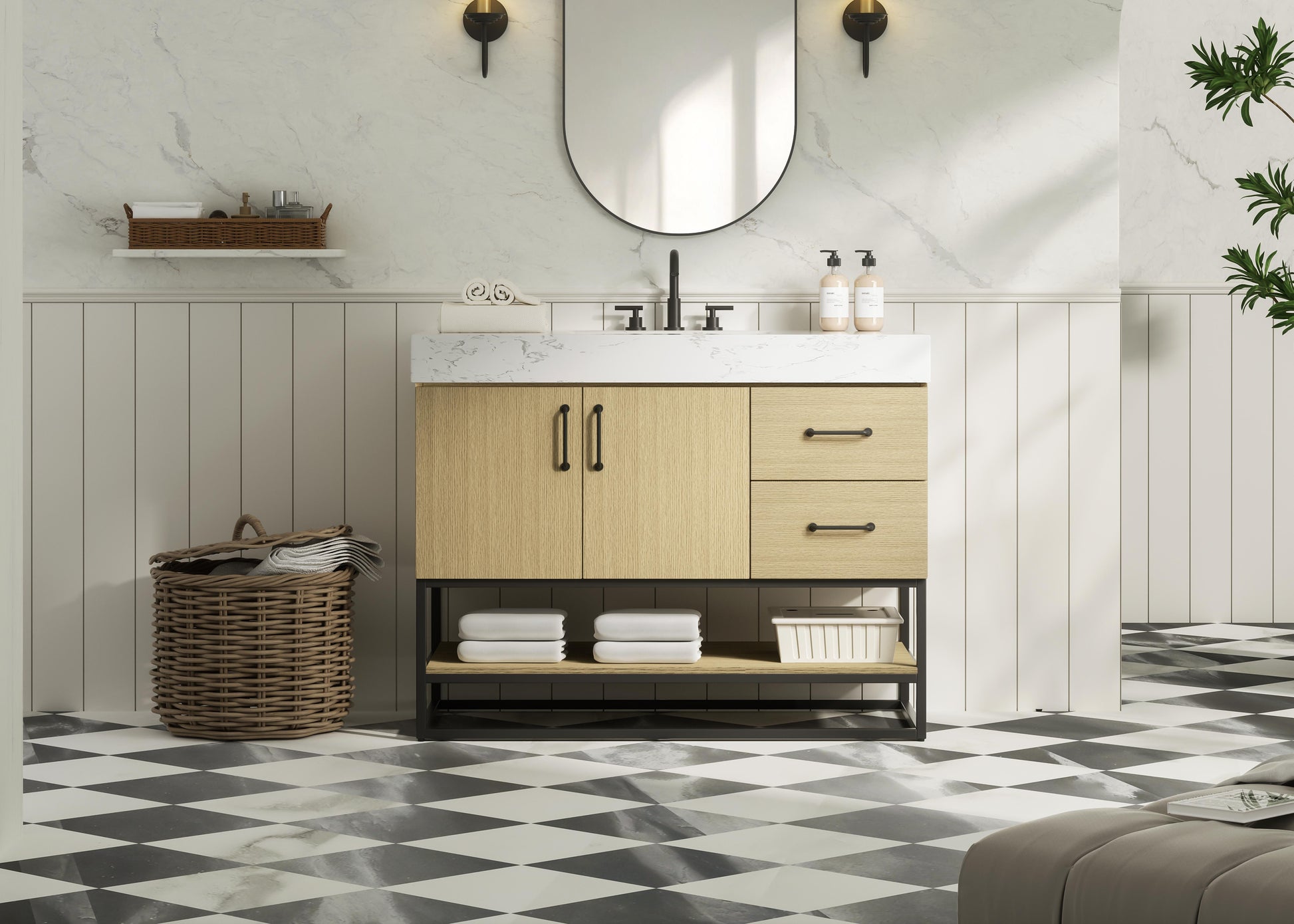 Upgrade your bathroom with this stylish transitional vanity, available in five stunning finishes, from crisp white to warm honey brown, designed to suit a variety of decor styles. The minimalist flat door panels and open wood shelf create a functional yet visually appealing storage solution, while the slender black metal legs elevate the look with modern sophistication. The 4-inch thick white engineered marble countertop, accented with natural veining, adds a luxurious touch, perfectly complemented by soft-closing doors with sleek black metal bar pulls. Thoughtful details like the concealed overflow, back panel cutout for plumbing, and 3 pre-drilled holes for an 8-inch faucet make installation easy and efficient. With a porcelain sink and farmhouse-inspired touches, this vanity brings both elegance and practicality to any bathroom setting.