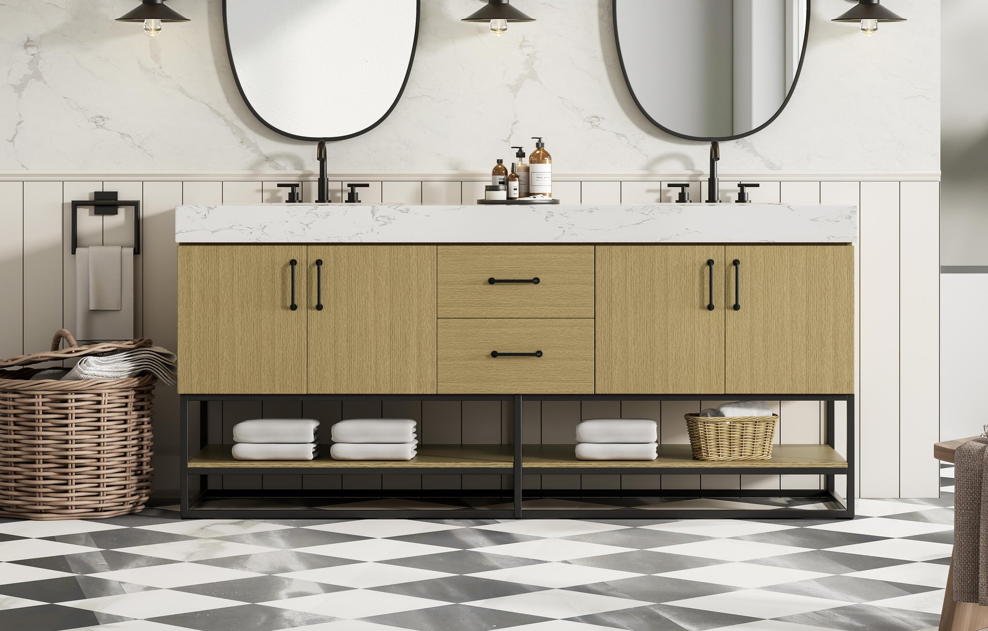 Upgrade your bathroom with this stylish transitional vanity, available in five stunning finishes, from crisp white to warm honey brown, designed to suit a variety of decor styles. The minimalist flat door panels and open wood shelf create a functional yet visually appealing storage solution, while the slender black metal legs elevate the look with modern sophistication. The 4-inch thick white engineered marble countertop, accented with natural veining, adds a luxurious touch, perfectly complemented by soft-closing doors with sleek black metal bar pulls. Thoughtful details like the concealed overflow, back panel cutout for plumbing, and 3 pre-drilled holes for an 8-inch faucet make installation easy and efficient. With a porcelain sink and farmhouse-inspired touches, this vanity brings both elegance and practicality to any bathroom setting.