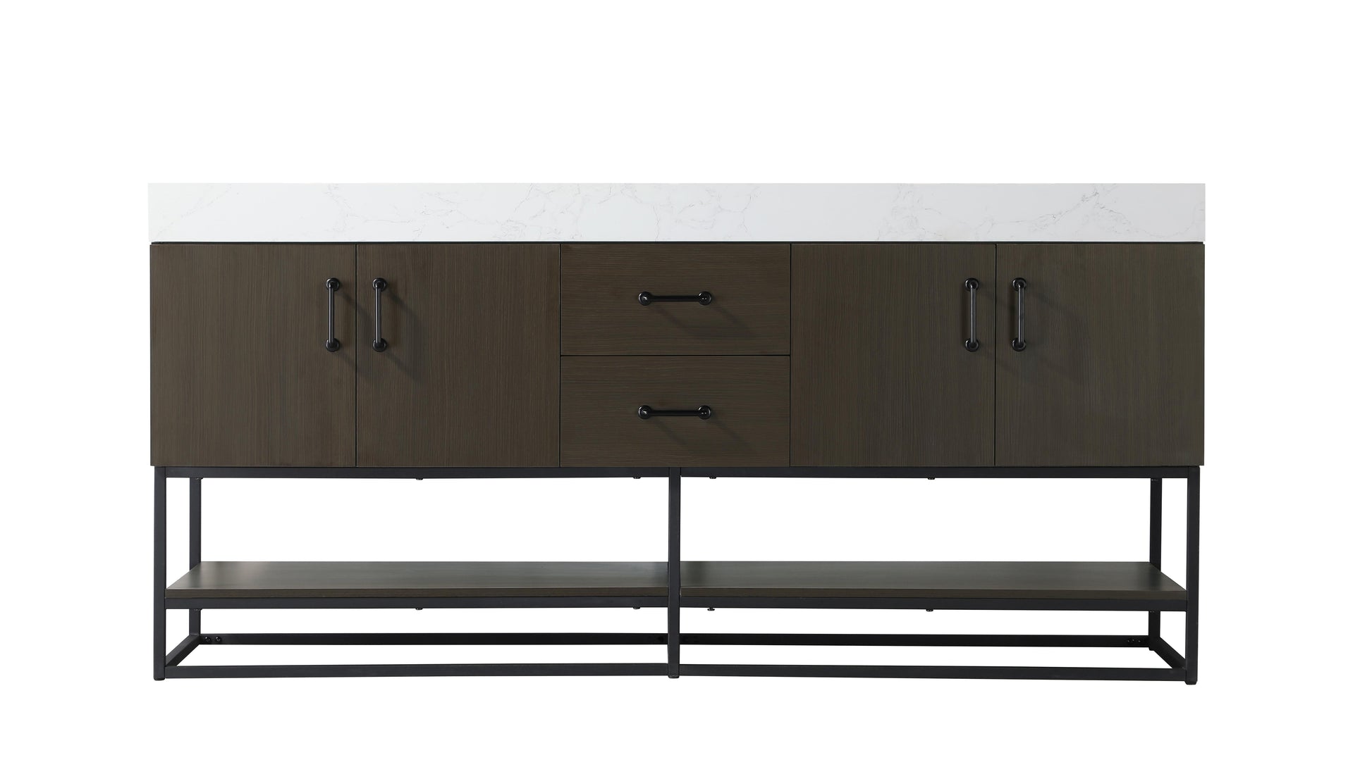 Upgrade your bathroom with this stylish transitional vanity, available in five stunning finishes, from crisp white to warm honey brown, designed to suit a variety of decor styles. The minimalist flat door panels and open wood shelf create a functional yet visually appealing storage solution, while the slender black metal legs elevate the look with modern sophistication. The 4-inch thick white engineered marble countertop, accented with natural veining, adds a luxurious touch, perfectly complemented by soft-closing doors with sleek black metal bar pulls. Thoughtful details like the concealed overflow, back panel cutout for plumbing, and 3 pre-drilled holes for an 8-inch faucet make installation easy and efficient. With a porcelain sink and farmhouse-inspired touches, this vanity brings both elegance and practicality to any bathroom setting.