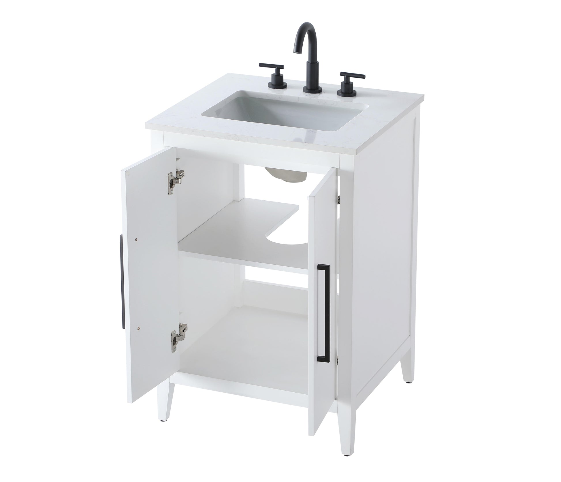 Bring both elegance and practicality to your bathroom with this transitional vanity, available in a selection of rich finishes that highlight the beauty of faux wood grain in shades of mocha, chestnut, and honey, along with classic white and modern grey. The flat door panels and sleek black metal pulls create a minimalist yet refined aesthetic, while the soft-closing drawers and tapered legs with levelers provide smooth, functional operation. Topped with a luxurious white engineered marble countertop and featuring a porcelain sink, this vanity combines timeless style with modern efficiency. Thoughtfully designed with U-shaped cutout for plumbing, it offers ample storage and easy installation, making it the perfect centerpiece for any bathroom.