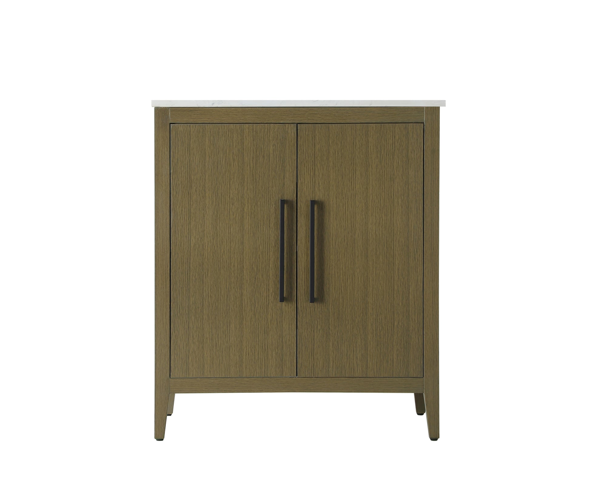 Bring both elegance and practicality to your bathroom with this transitional vanity, available in a selection of rich finishes that highlight the beauty of faux wood grain in shades of mocha, chestnut, and honey, along with classic white and modern grey. The flat door panels and sleek black metal pulls create a minimalist yet refined aesthetic, while the soft-closing drawers and tapered legs with levelers provide smooth, functional operation. Topped with a luxurious white engineered marble countertop and featuring a porcelain sink, this vanity combines timeless style with modern efficiency. Thoughtfully designed with U-shaped cutout for plumbing, it offers ample storage and easy installation, making it the perfect centerpiece for any bathroom.