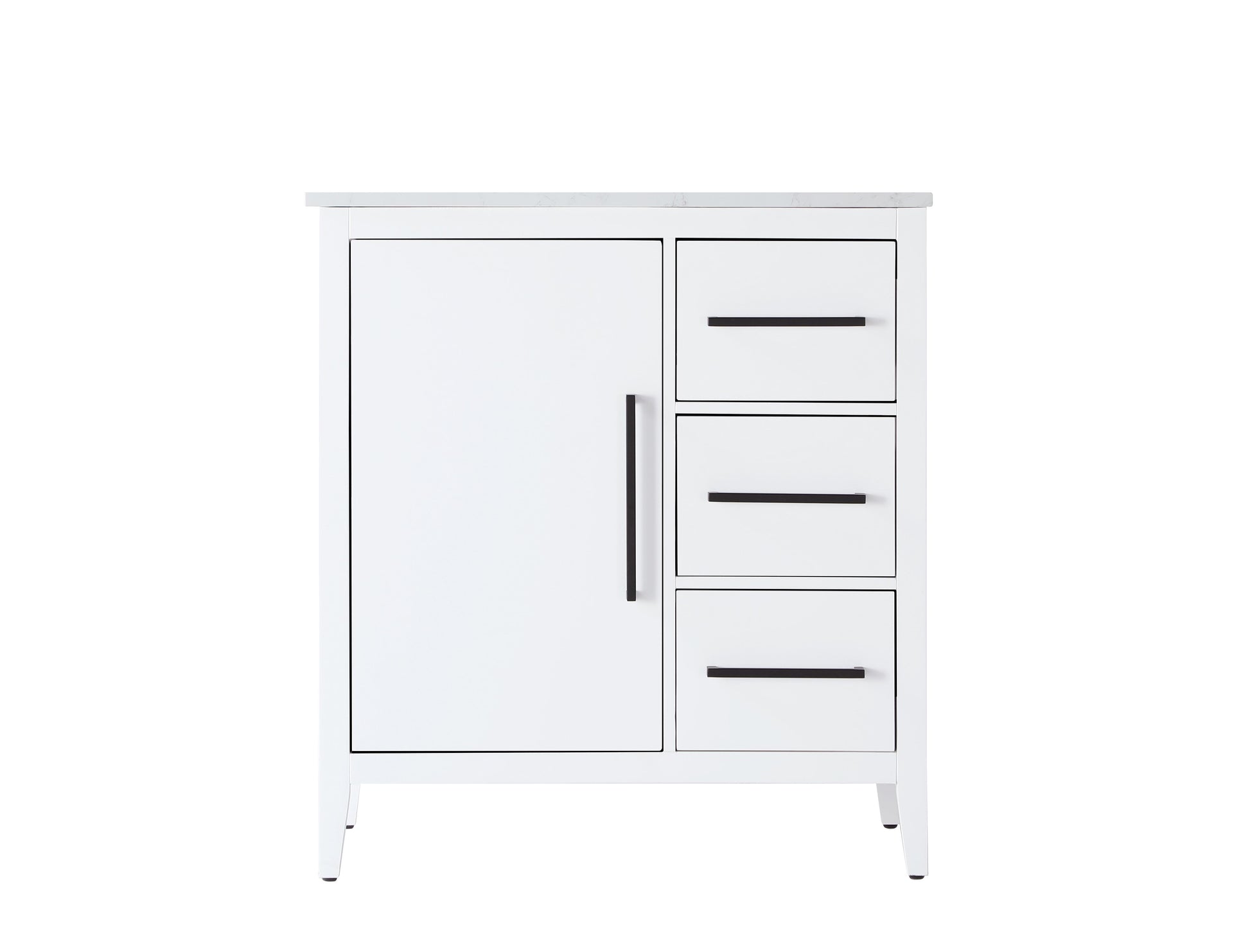 Bring both elegance and practicality to your bathroom with this transitional vanity, available in a selection of rich finishes that highlight the beauty of faux wood grain in shades of mocha, chestnut, and honey, along with classic white and modern grey. The flat door panels and sleek black metal pulls create a minimalist yet refined aesthetic, while the soft-closing drawers and tapered legs with levelers provide smooth, functional operation. Topped with a luxurious white engineered marble countertop and featuring a porcelain sink, this vanity combines timeless style with modern efficiency. Thoughtfully designed with U-shaped cutout for plumbing, it offers ample storage and easy installation, making it the perfect centerpiece for any bathroom.