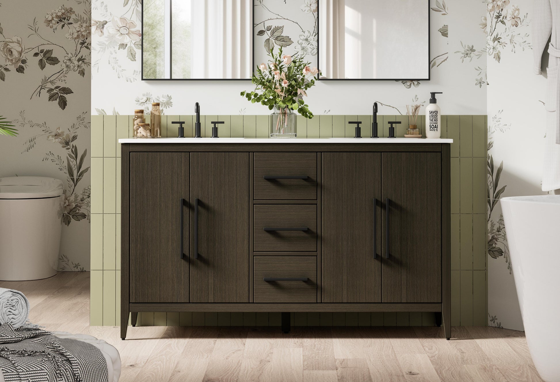 Bring both elegance and practicality to your bathroom with this transitional vanity, available in a selection of rich finishes that highlight the beauty of faux wood grain in shades of mocha, chestnut, and honey, along with classic white and modern grey. The flat door panels and sleek black metal pulls create a minimalist yet refined aesthetic, while the soft-closing drawers and tapered legs with levelers provide smooth, functional operation. Topped with a luxurious white engineered marble countertop and featuring a porcelain sink, this vanity combines timeless style with modern efficiency. Thoughtfully designed with U-shaped cutout for plumbing, it offers ample storage and easy installation, making it the perfect centerpiece for any bathroom.