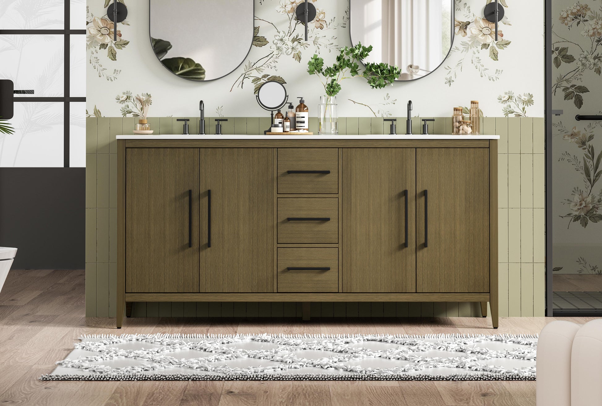 Bring both elegance and practicality to your bathroom with this transitional vanity, available in a selection of rich finishes that highlight the beauty of faux wood grain in shades of mocha, chestnut, and honey, along with classic white and modern grey. The flat door panels and sleek black metal pulls create a minimalist yet refined aesthetic, while the soft-closing drawers and tapered legs with levelers provide smooth, functional operation. Topped with a luxurious white engineered marble countertop and featuring a porcelain sink, this vanity combines timeless style with modern efficiency. Thoughtfully designed with U-shaped cutout for plumbing, it offers ample storage and easy installation, making it the perfect centerpiece for any bathroom.