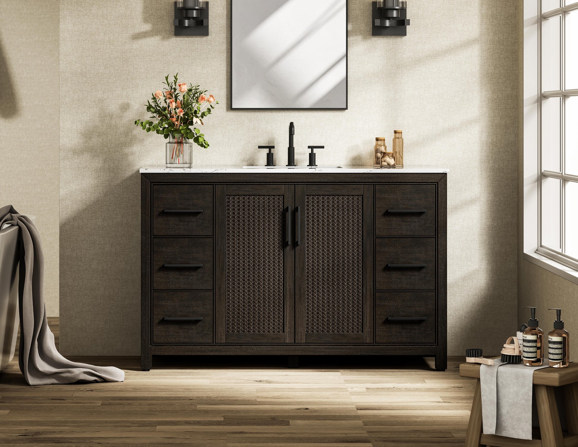 Perfect for those with an eye for detail and quality, this transitional vanity blends modern design with timeless elegance. Available in five stunning finishes, from Crisp White to Linen Oak, the wood grain visuals of the oak options bring warmth and character to any bathroom. The caning design on the Shaker-style door panels adds texture and a touch of refinement, while the soft-closing doors and drawers ensure smooth, quiet functionality. Topped with a white engineered marble countertop, the vanity offers both luxury and practicality, complete with pre-drilled faucet holes for customization. A concealed overflow and U-shaped shelf for plumbing make installation effortless, and the slender black metal pulls provide a sleek contrast.