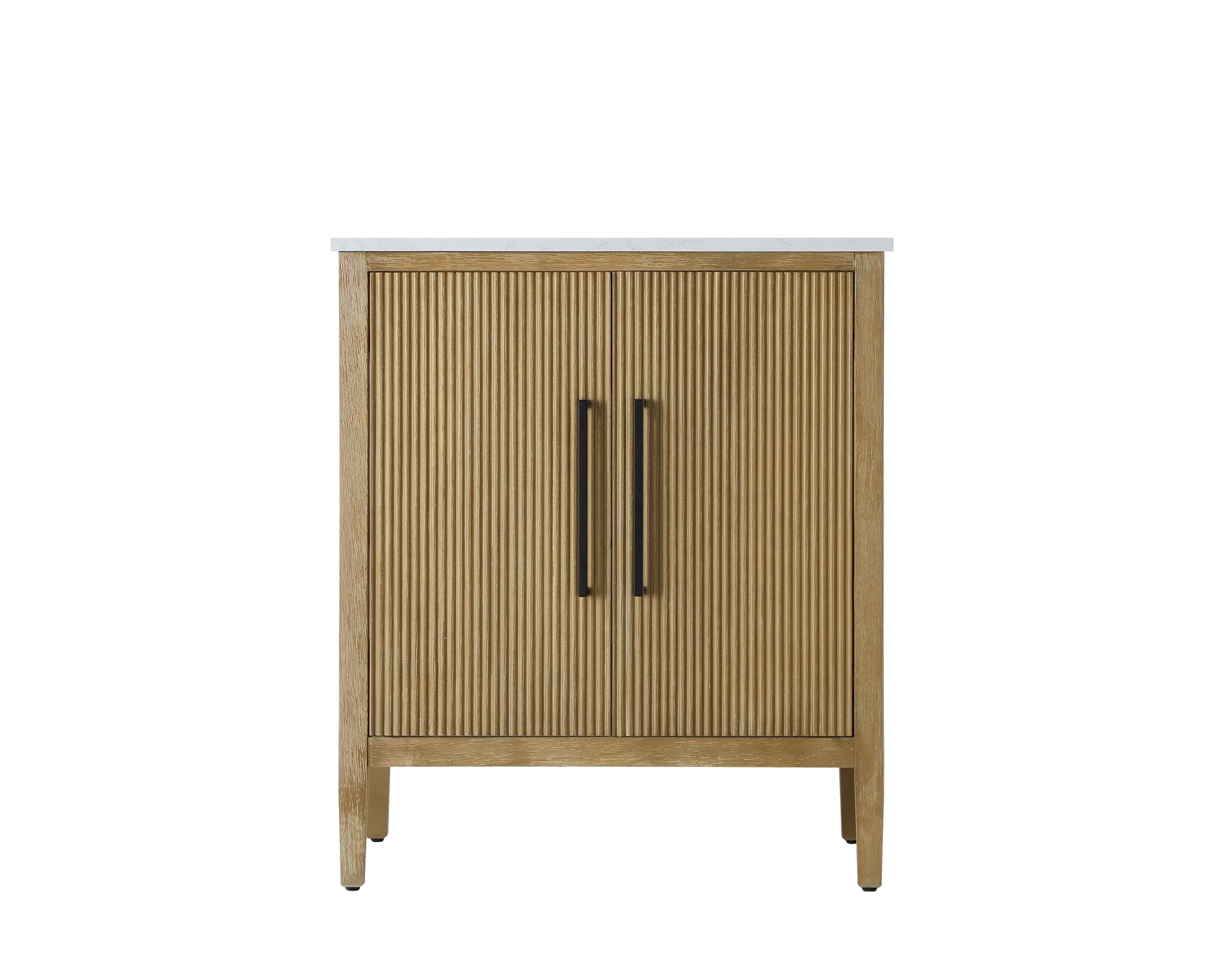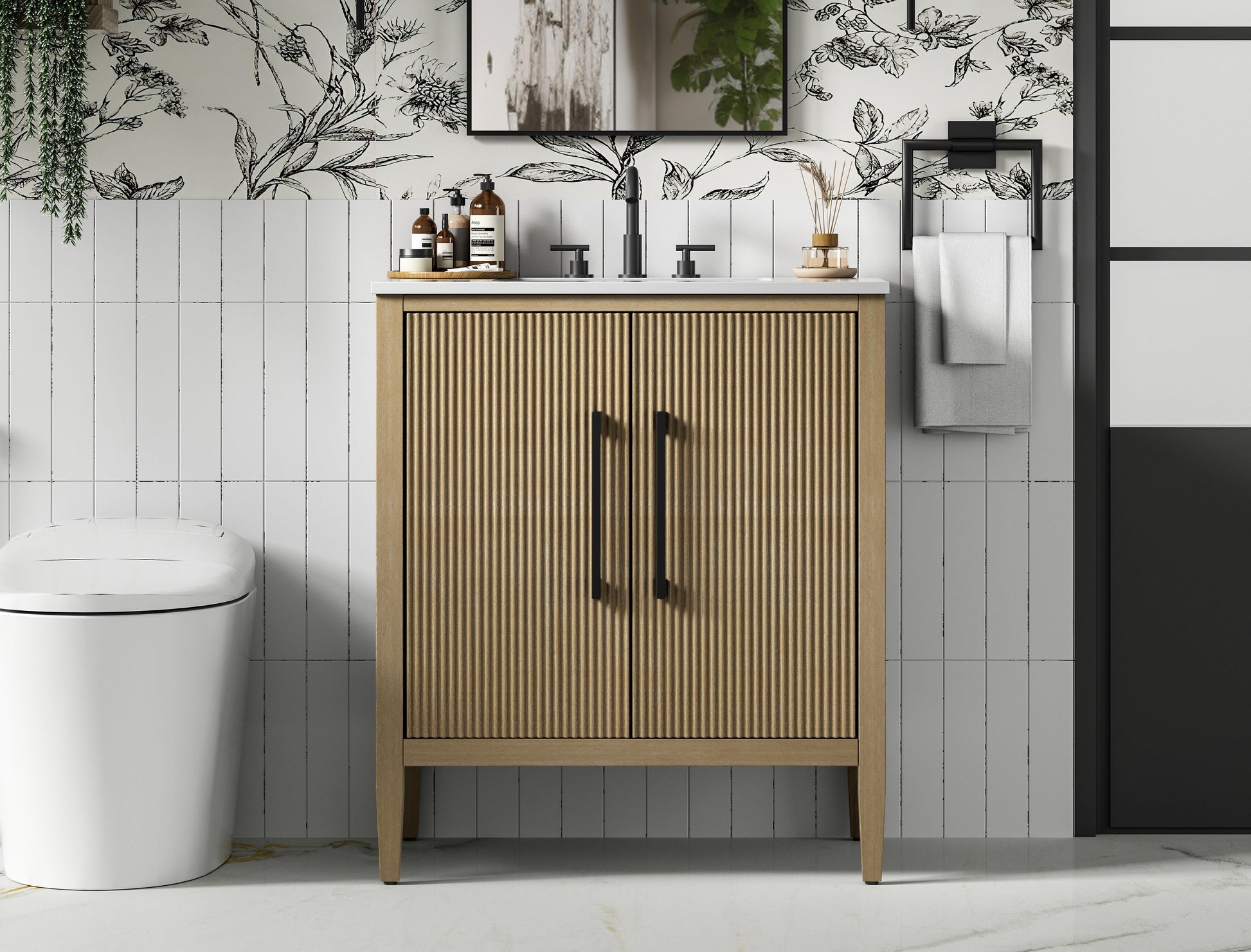 Designed with transitional elegance in mind, this bathroom vanity seamlessly blends traditional elements with modern functionality. Available in five stunning finishes, from the clean sophistication of Crisp White to the natural warmth of Honey Oak, the fluted door and drawer panels add subtle texture and charm. The white engineered marble countertop with natural veining exudes luxury, while the soft-closing doors with sleek black metal pulls offer a quiet, refined experience. Practicality is never compromised, with features like the U-shaped shelf for plumbing, and pre-drilled faucet holes for easy customization. Whether your style leans modern or classic, this vanity is the perfect balance of beauty and function, appealing to customers with a taste for quality and style.