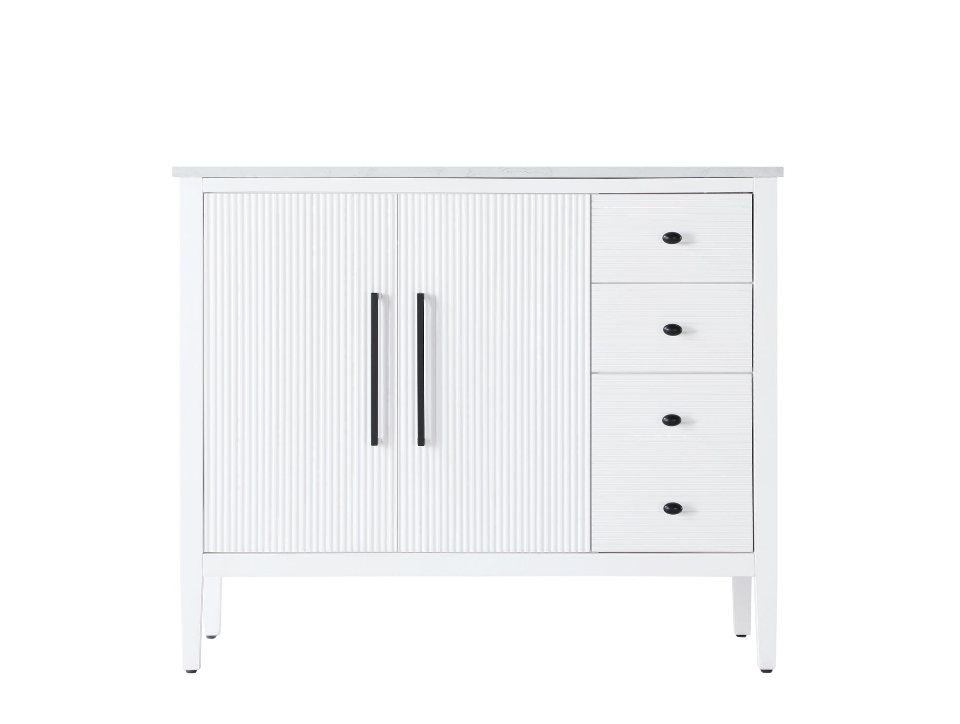 Designed with transitional elegance in mind, this bathroom vanity seamlessly blends traditional elements with modern functionality. Available in five stunning finishes, from the clean sophistication of Crisp White to the natural warmth of Honey Oak, the fluted door and drawer panels add subtle texture and charm. The white engineered marble countertop with natural veining exudes luxury, while the soft-closing doors and drawers with sleek black metal pulls offer a quiet, refined experience. Practicality is never compromised, with features like the U-shaped shelf for plumbing, deeper bottom drawer for ample storage, and pre-drilled faucet holes for easy customization. Whether your style leans modern or classic, this vanity is the perfect balance of beauty and function, appealing to customers with a taste for quality and style.