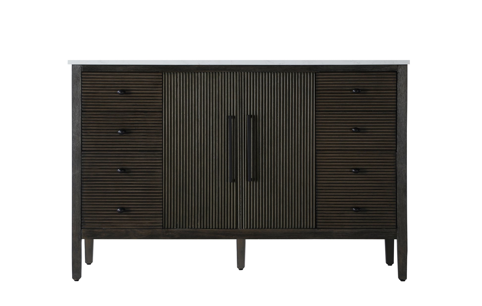 Designed with transitional elegance in mind, this bathroom vanity seamlessly blends traditional elements with modern functionality. Available in five stunning finishes, from the clean sophistication of Crisp White to the natural warmth of Honey Oak, the fluted door and drawer panels add subtle texture and charm. The white engineered marble countertop with natural veining exudes luxury, while the soft-closing doors and drawers with sleek black metal pulls offer a quiet, refined experience. Practicality is never compromised, with features like the U-shaped shelf for plumbing, deeper bottom drawer for ample storage, and pre-drilled faucet holes for easy customization. Whether your style leans modern or classic, this vanity is the perfect balance of beauty and function, appealing to customers with a taste for quality and style.