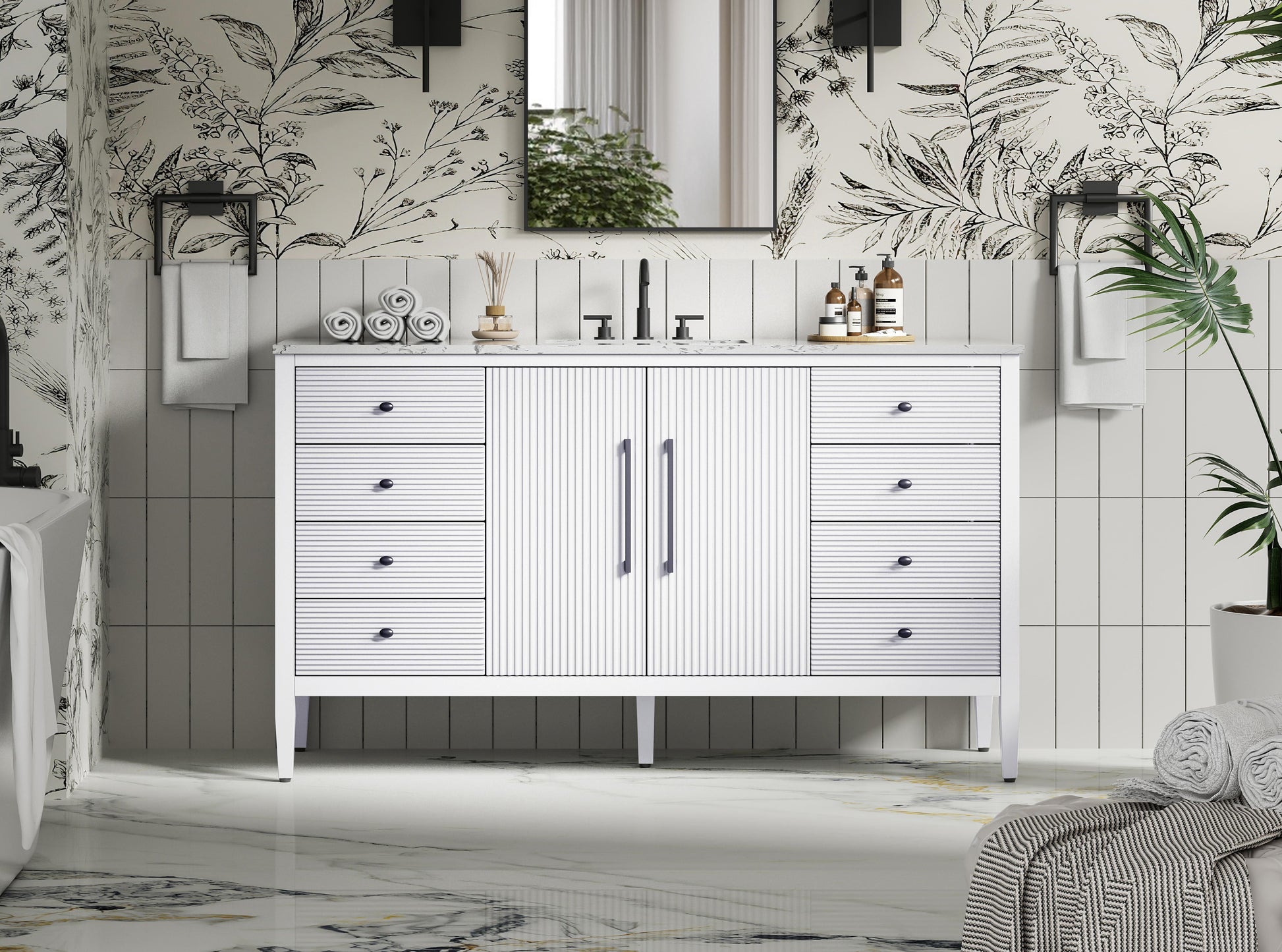 Designed with transitional elegance in mind, this bathroom vanity seamlessly blends traditional elements with modern functionality. Available in five stunning finishes, from the clean sophistication of Crisp White to the natural warmth of Honey Oak, the fluted door and drawer panels add subtle texture and charm. The white engineered marble countertop with natural veining exudes luxury, while the soft-closing doors and drawers with sleek black metal pulls offer a quiet, refined experience. Practicality is never compromised, with features like the U-shaped shelf for plumbing, deeper bottom drawer for ample storage, and pre-drilled faucet holes for easy customization. Whether your style leans modern or classic, this vanity is the perfect balance of beauty and function, appealing to customers with a taste for quality and style.