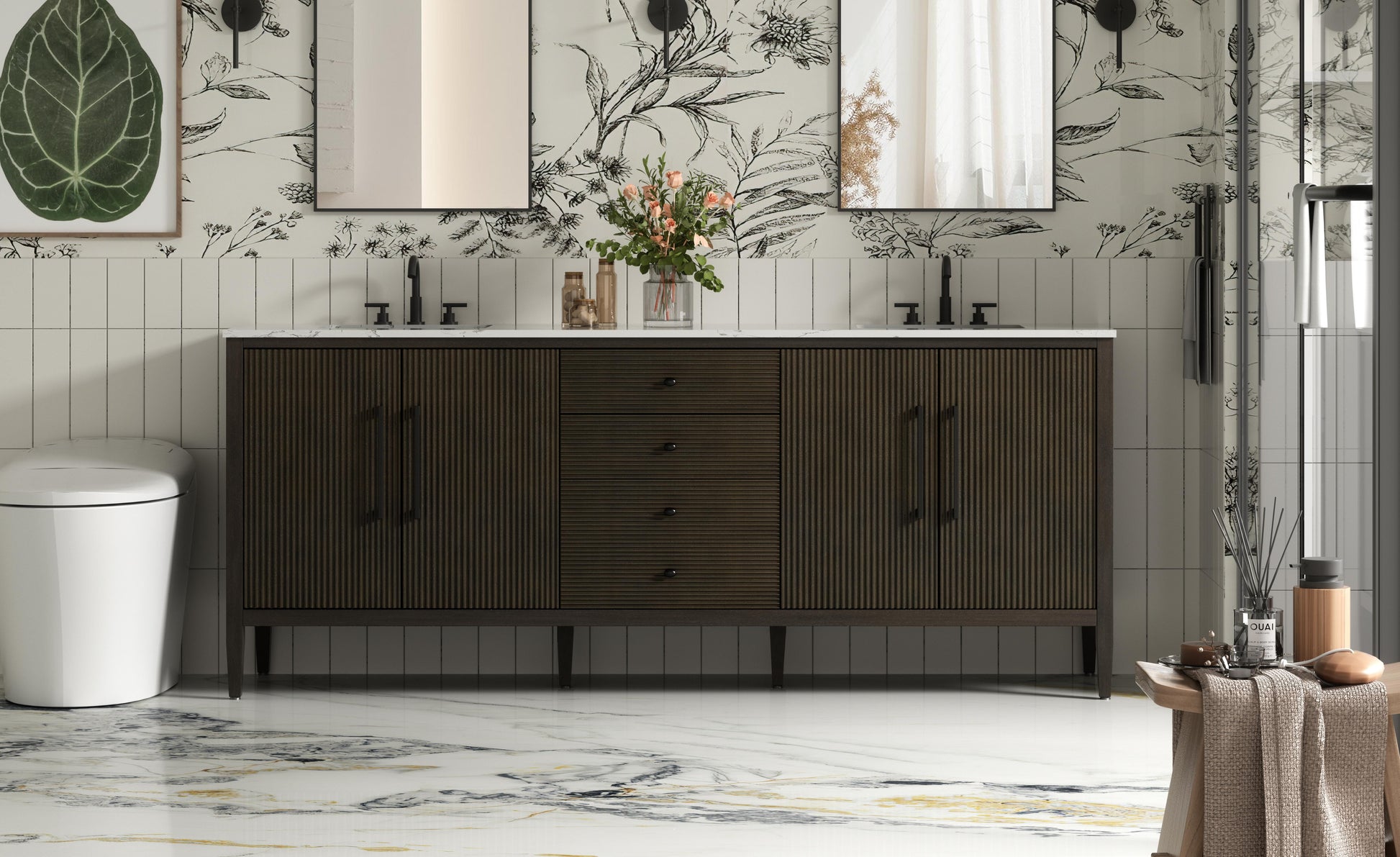 Designed with transitional elegance in mind, this bathroom vanity seamlessly blends traditional elements with modern functionality. Available in five stunning finishes, from the clean sophistication of Crisp White to the natural warmth of Honey Oak, the fluted door and drawer panels add subtle texture and charm. The white engineered marble countertop with natural veining exudes luxury, while the soft-closing doors and drawers with sleek black metal pulls offer a quiet, refined experience. Practicality is never compromised, with features like the U-shaped shelf for plumbing, deeper bottom drawer for ample storage, and pre-drilled faucet holes for easy customization. Whether your style leans modern or classic, this vanity is the perfect balance of beauty and function, appealing to customers with a taste for quality and style.