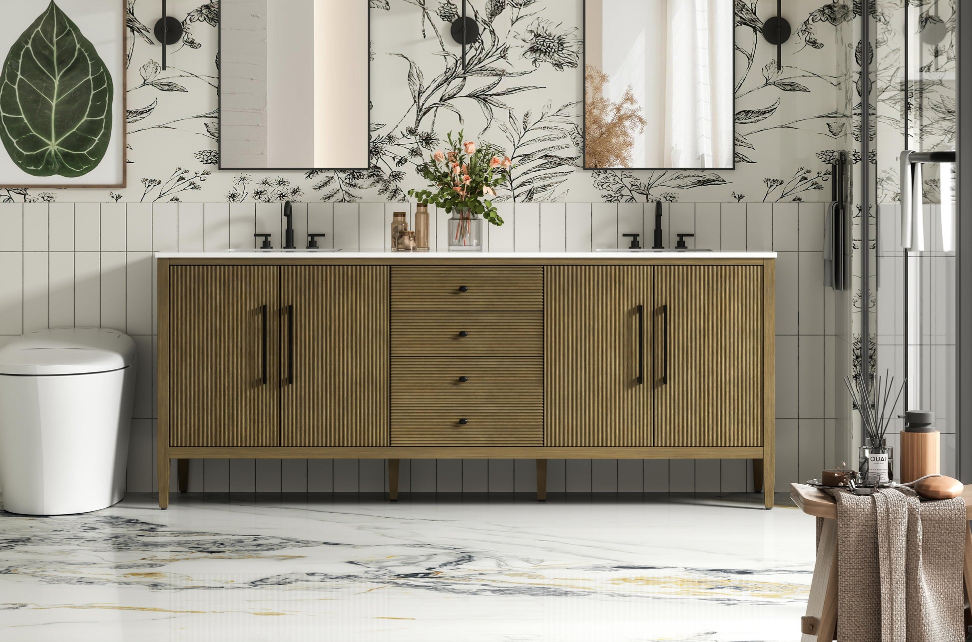 Designed with transitional elegance in mind, this bathroom vanity seamlessly blends traditional elements with modern functionality. Available in five stunning finishes, from the clean sophistication of Crisp White to the natural warmth of Honey Oak, the fluted door and drawer panels add subtle texture and charm. The white engineered marble countertop with natural veining exudes luxury, while the soft-closing doors and drawers with sleek black metal pulls offer a quiet, refined experience. Practicality is never compromised, with features like the U-shaped shelf for plumbing, deeper bottom drawer for ample storage, and pre-drilled faucet holes for easy customization. Whether your style leans modern or classic, this vanity is the perfect balance of beauty and function, appealing to customers with a taste for quality and style.