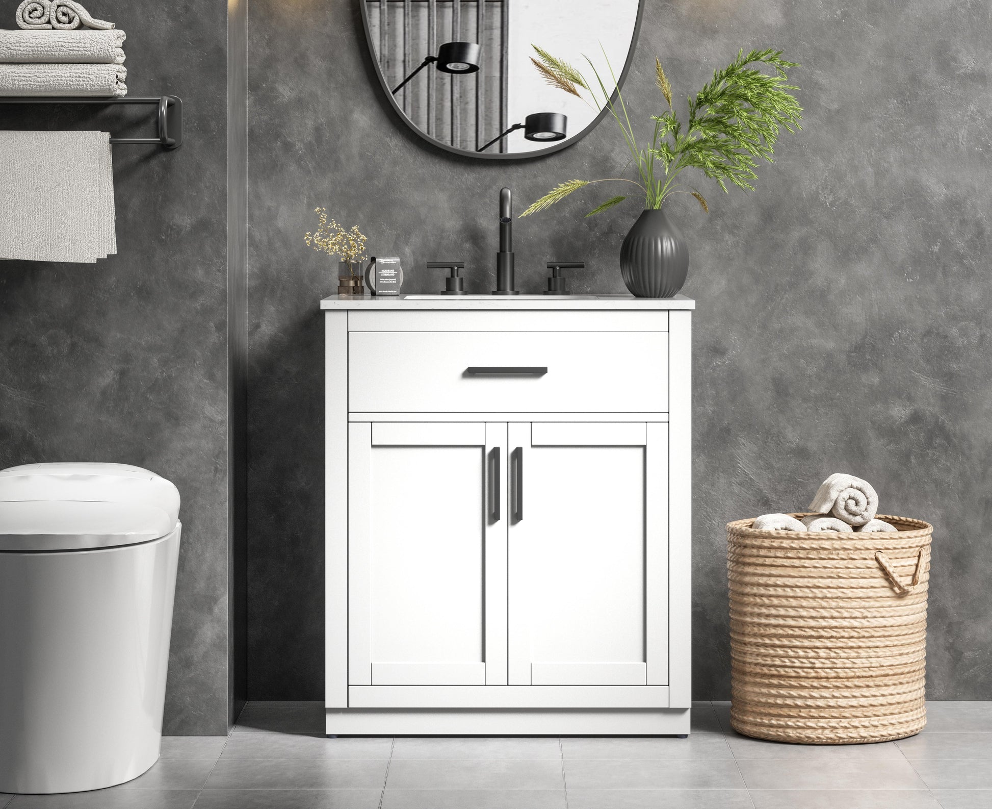 Introduce a perfect balance of functionality and style to your bathroom with this thoughtfully designed vanity. Constructed with a combination of solid wood and MDF, it offers durability and a sturdy build. The sleek engineered marble countertop with subtle grey marbling complements the rustic wood grain finish, creating a stylish and inviting centerpiece for your bathroom. Designed in a contemporary style with a transitional flair, it features a U-shaped shelf for seamless plumbing integration and multiple soft-close drawers for clutter-free organization. A pull-down drawer enhances convenience, while the toe kick adds a refined, clean-lined appearance and simplifies cleaning underneath. Matte black hardware contrasts beautifully with the cabinet finish, tying the look together. Delivered fully assembled and equipped with foot levelers, this vanity combines practicality and aesthetic appeal to suit modern and transitional bathrooms alike.