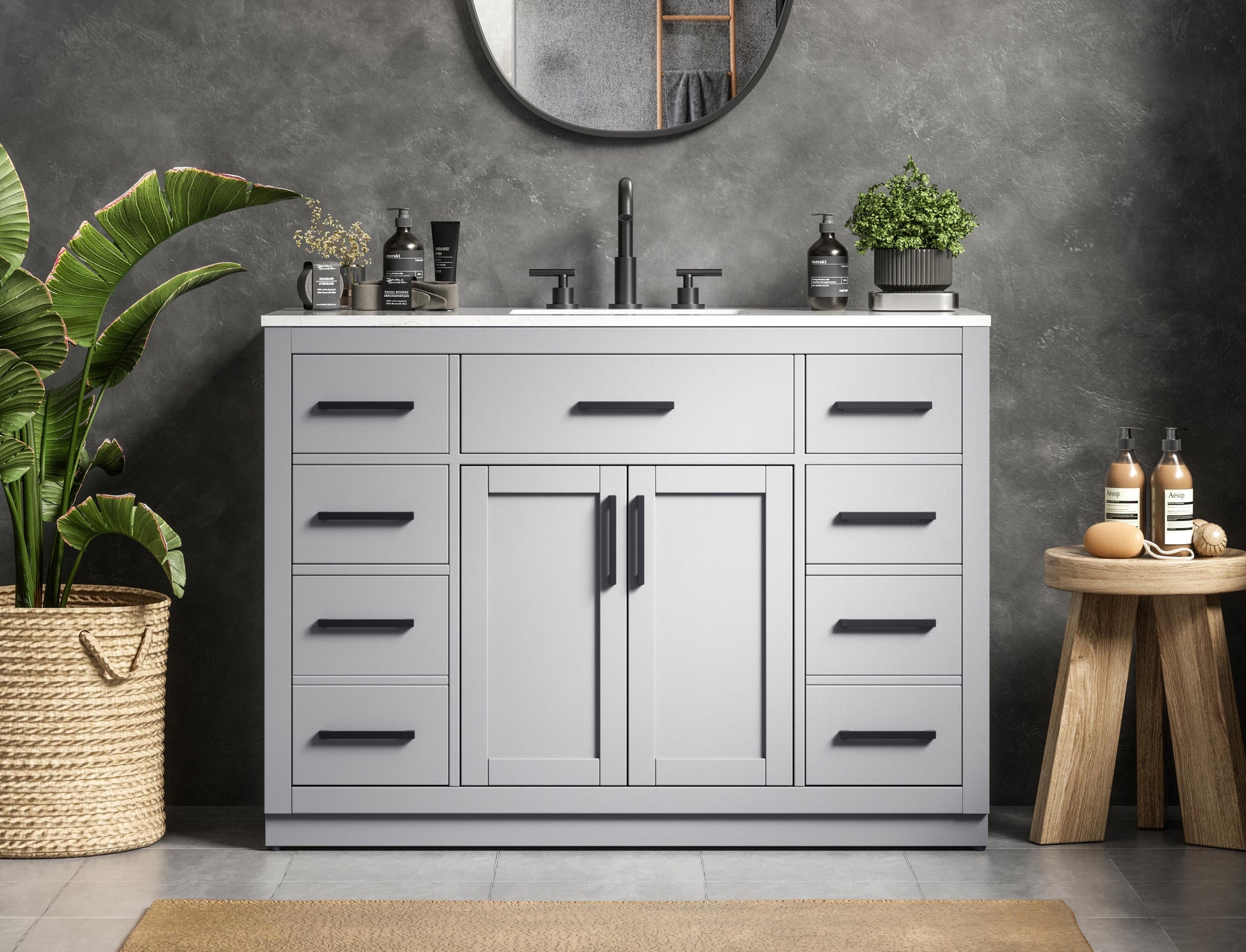 Introduce a perfect balance of functionality and style to your bathroom with this thoughtfully designed vanity. Constructed with a combination of solid wood and MDF, it offers durability and a sturdy build. The sleek engineered marble countertop with subtle grey marbling complements the rustic wood grain finish, creating a stylish and inviting centerpiece for your bathroom. Designed in a contemporary style with a transitional flair, it features a U-shaped shelf for seamless plumbing integration and multiple soft-close drawers for clutter-free organization. A pull-down drawer enhances convenience, while the toe kick adds a refined, clean-lined appearance and simplifies cleaning underneath. Matte black hardware contrasts beautifully with the cabinet finish, tying the look together. Delivered fully assembled and equipped with foot levelers, this vanity combines practicality and aesthetic appeal to suit modern and transitional bathrooms alike.