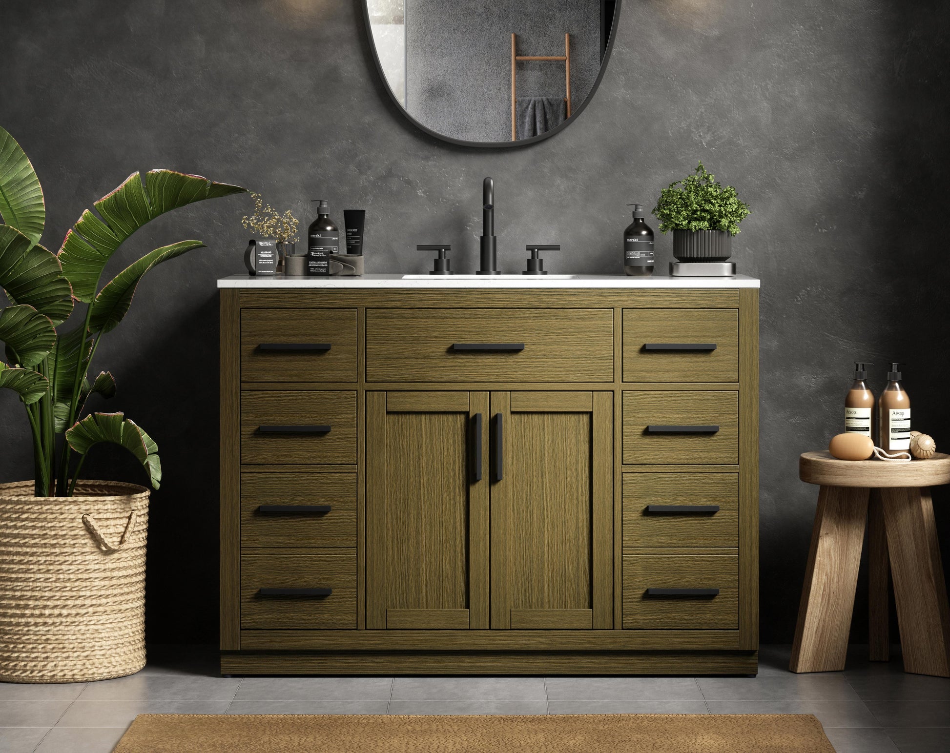 Introduce a perfect balance of functionality and style to your bathroom with this thoughtfully designed vanity. Constructed with a combination of solid wood and MDF, it offers durability and a sturdy build. The sleek engineered marble countertop with subtle grey marbling complements the rustic wood grain finish, creating a stylish and inviting centerpiece for your bathroom. Designed in a contemporary style with a transitional flair, it features a U-shaped shelf for seamless plumbing integration and multiple soft-close drawers for clutter-free organization. A pull-down drawer enhances convenience, while the toe kick adds a refined, clean-lined appearance and simplifies cleaning underneath. Matte black hardware contrasts beautifully with the cabinet finish, tying the look together. Delivered fully assembled and equipped with foot levelers, this vanity combines practicality and aesthetic appeal to suit modern and transitional bathrooms alike.