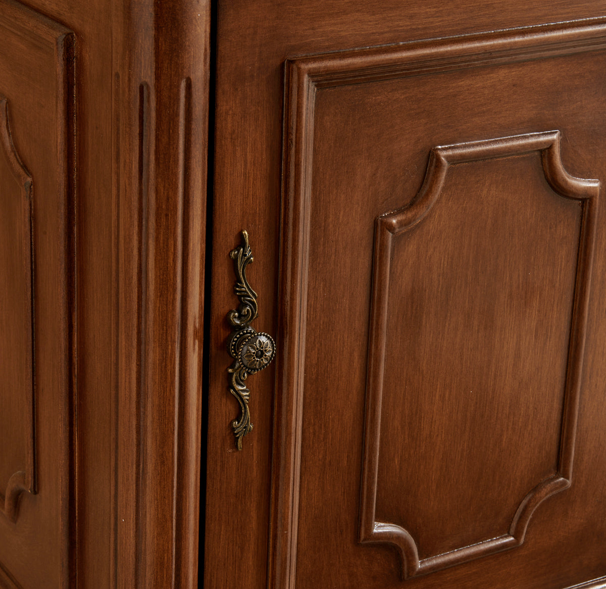 Retro vanity beautifully balances modern-day features and classic charm, making it a wonderful enhancement to your home or office bathroom. Highlighted by its durable use of an ivory white engineered marble countertop that enhances the hand painted cabinet. Comes with an oval white porcelain undermount sink, decorated with detailed carving and scalloped pedestal base. A solid shelf behind the door that provides ample space for your daily necessity. With antique bronze finish door pulls, this stately vanity is truly a majestic bath furniture. The cabinet is constructed of kiln-dried solid wood and MDF.