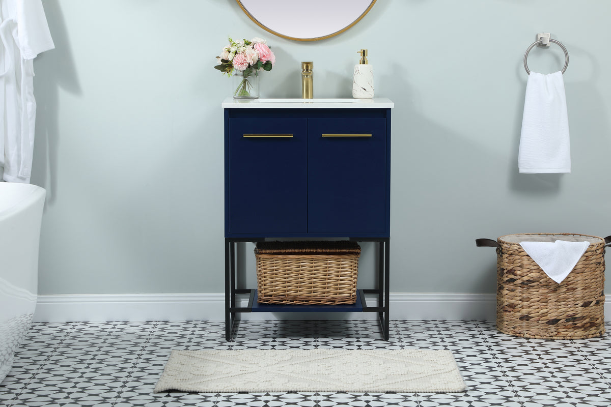 Live in modern comfort with this 24" blue finish vanity. Dressed in a blue and sleek gold metal hardware, its contemporary style will have your bathroom or powder room elevated in industrial sophistication. The open shelf at the base and two doors reveal ample storage space for your bathroom essentials and miscellany. Clean lines create its own visual interest, adding trendy looks to your already chic room.