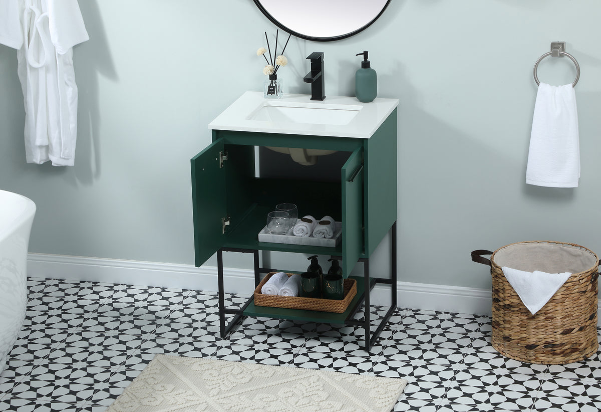 Live in modern comfort with this 24" green finish vanity. Dressed in a green and sleek black metal hardware, its contemporary style will have your bathroom or powder room elevated in industrial sophistication. The open shelf at the base and two doors reveal ample storage space for your bathroom essentials and miscellany. Clean lines create its own visual interest, adding trendy looks to your already chic room.