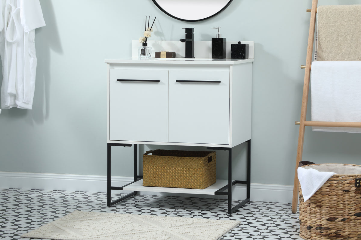 Live in modern comfort with this 30" white finish vanity. Dressed in a white and sleek black metal hardware, its contemporary style will have your bathroom or powder room elevated in industrial sophistication. The open shelf at the base and two doors reveal ample storage space for your bathroom essentials and miscellany. Clean lines create its own visual interest, adding trendy looks to your already chic room. Comes with a matching backsplash to complete the look and protects your wall.