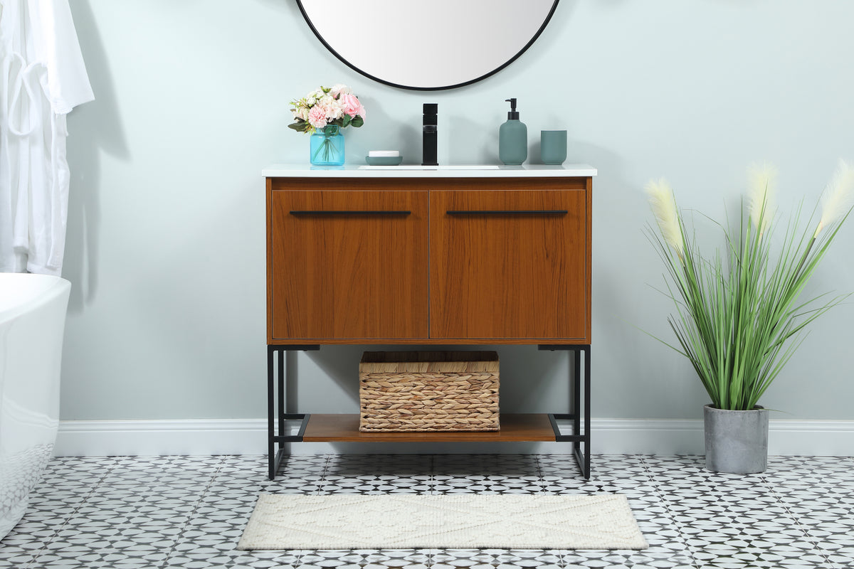 Live in modern comfort with this 36" teak finish vanity. Dressed in a teak and sleek black metal hardware, its contemporary style will have your bathroom or powder room elevated in industrial sophistication. The open shelf at the base and two doors reveal ample storage space for your bathroom essentials and miscellany. Clean lines create its own visual interest, adding trendy looks to your already chic room.