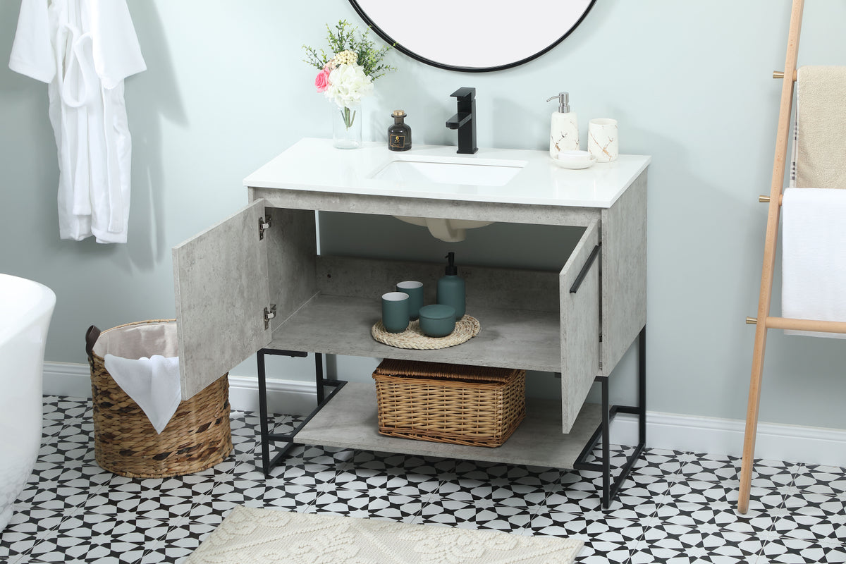 Live in modern comfort with this 40" concrete grey finish vanity. Dressed in a concrete grey and sleek black metal hardware, its contemporary style will have your bathroom or powder room elevated in industrial sophistication. The open shelf at the base and two doors reveal ample storage space for your bathroom essentials and miscellany. Clean lines create its own visual interest, adding trendy looks to your already chic room.