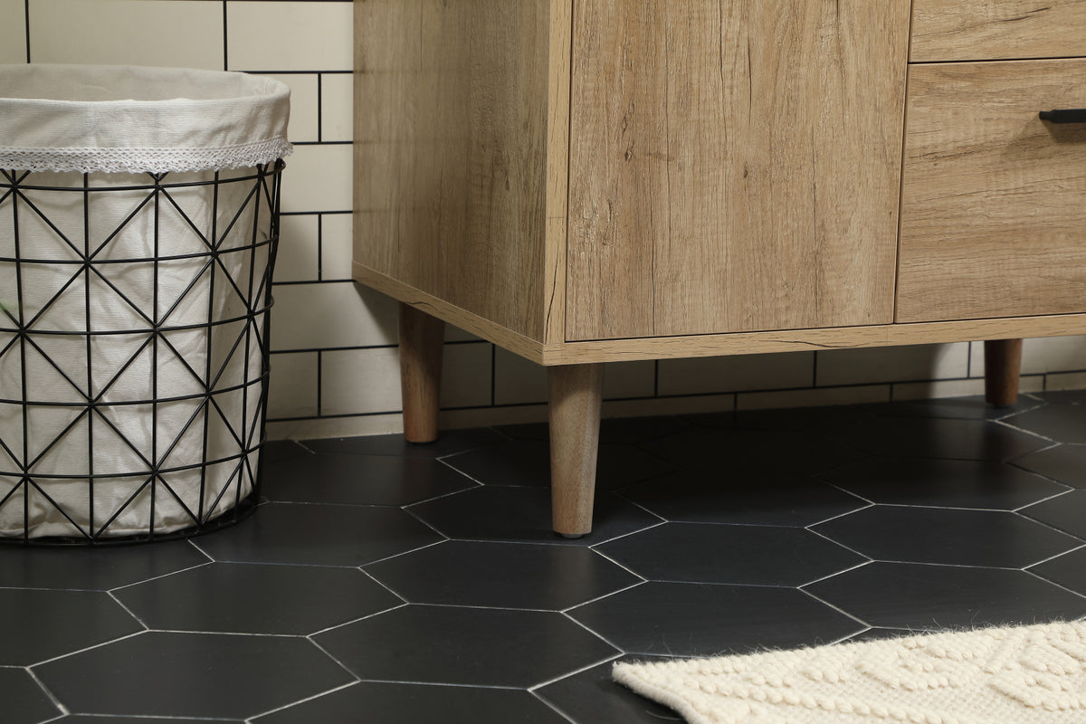 Exquisite modern sophistication is defined with the wood look and black barpulls of this vanity and slender tapered legs. Its length makes it the perfect addition to any sized home, and saves space with its storage area hidden behind the Single cabinet doors and two functional drawers. Topped with a highly durable engineered marble countertop and a porcelain undermount sink, this modern design will become your focal point of your bathroom or powder room. Equipped with soft-closing drawer and doors adds a quiet functional touch. Comes with a matching backsplash to complete the look and protects your wall.
