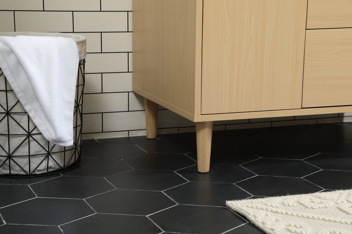 Modern sophistication is defined with the mape finish and black barpulls of this vanity and slender tapered legs. Its length makes it the perfect addition to any sized home, and saves space with its storage area hidden behind the Single cabinet door and two bottom drawers. Topped with a highly durable engineered stone countertop and a porcelain undermount sink, this modern design will become your focal point of your bathroom or powder room. Comes with a matching backsplash to complete the look and protects your wall. Equipped with soft-closing drawer and doors adds a quiet functional touch.