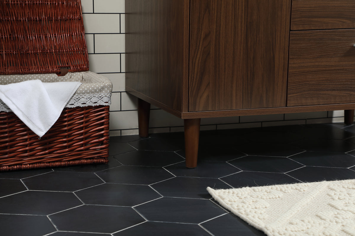 Modern sophistication is defined with the walnut finish and silver barpulls of this vanity and slender tapered legs. Its length makes it the perfect addition to any sized home, and saves space with its storage area hidden behind the Single cabinet door and two bottom drawers. Topped with a highly durable engineered stone countertop and a porcelain undermount sink, this modern design will become your focal point of your bathroom or powder room. Equipped with soft-closing drawer and doors adds a quiet functional touch.