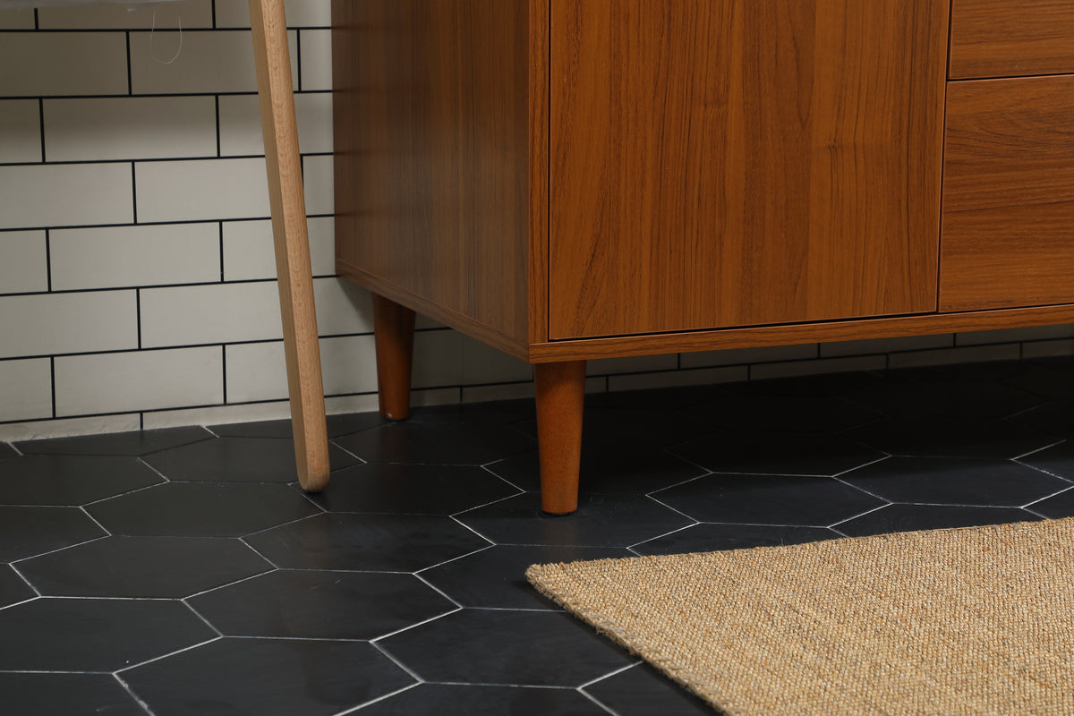 Modern sophistication is defined with the teak finish and black barpulls of this vanity and slender tapered legs. Its length makes it the perfect addition to any sized home, and saves space with its storage area hidden behind the Single cabinet door and two bottom drawers. Topped with a highly durable engineered stone countertop and a porcelain undermount sink, this modern design will become your focal point of your bathroom. Equipped with soft-closing drawer and doors adds a quiet functional touch.