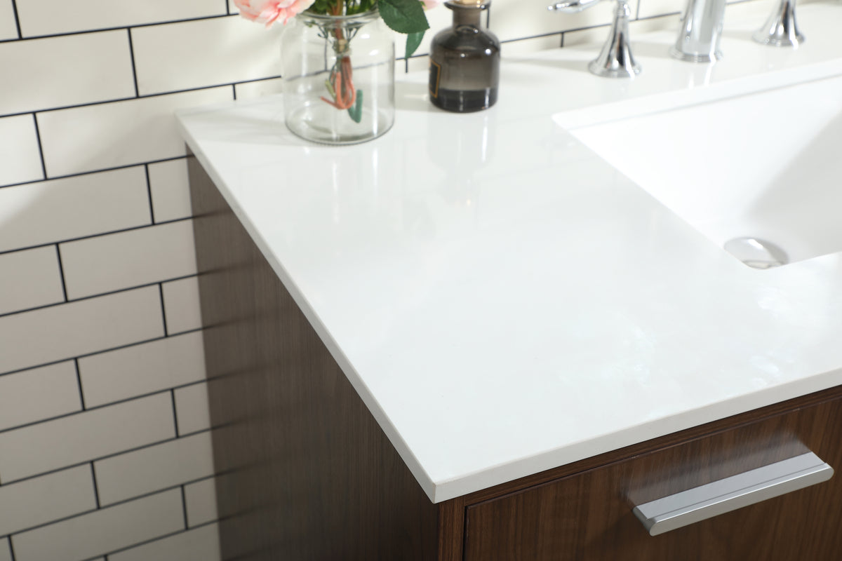 Modern sophistication is defined with the walnut finish and silver barpulls of this vanity and slender tapered legs. Its length makes it the perfect addition to any sized home, and saves space with its storage area hidden behind the Single cabinet door and two bottom drawers. Topped with a highly durable engineered stone countertop and a porcelain undermount sink, this modern design will become your focal point of your bathroom. Equipped with soft-closing drawer and doors adds a quiet functional touch.