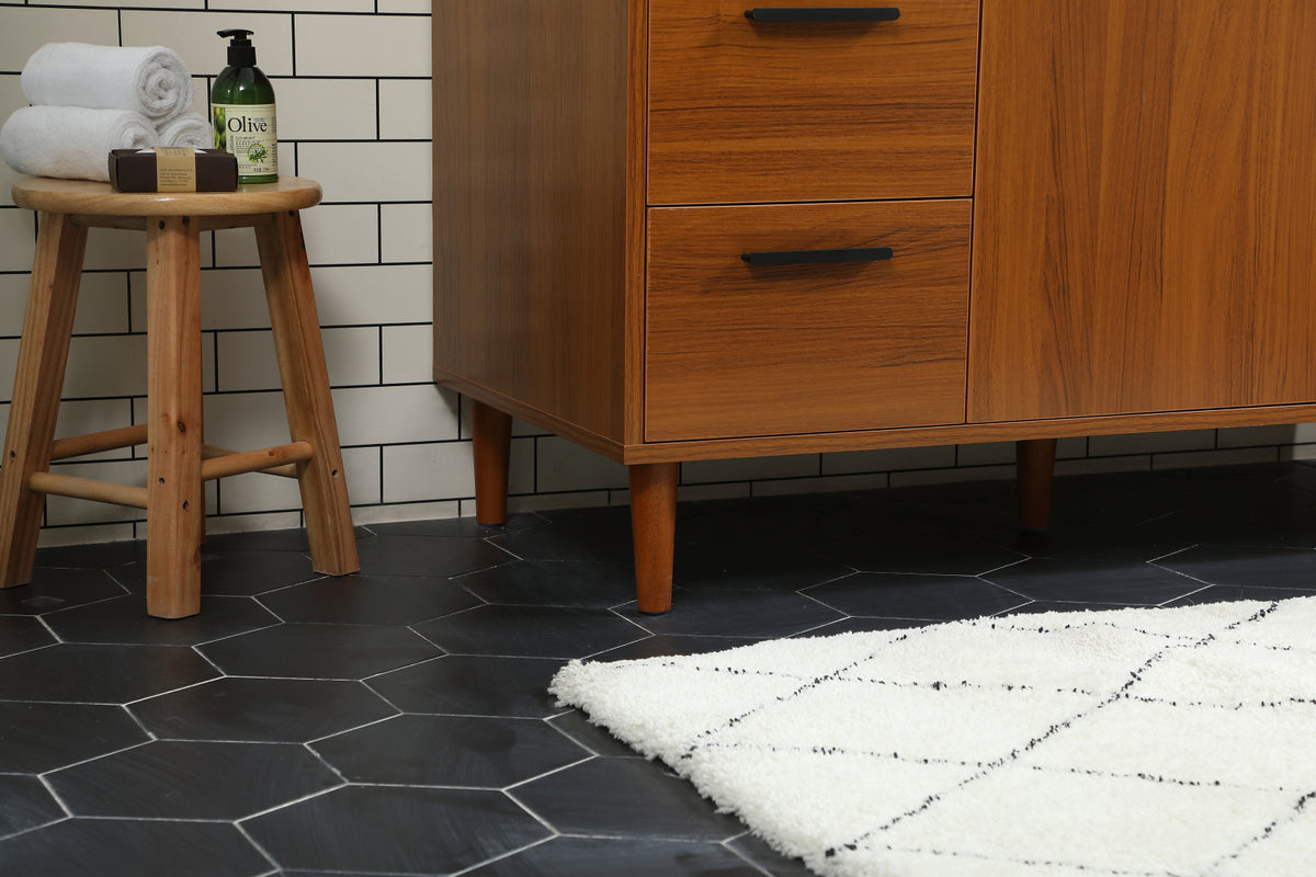Modern sophistication is defined with the teak finish and black barpulls of this vanity and slender tapered legs. Its length makes it the perfect addition to any sized home, and saves space with its storage area hidden behind the Single cabinet door and six drawers. Topped with a highly durable engineered stone countertop and a porcelain undermount sink, this modern design will become your focal point of your bathroom. Comes with a matching backsplash to complete the look and protects your wall. Equipped with soft-closing drawer and doors adds a quiet functional touch.