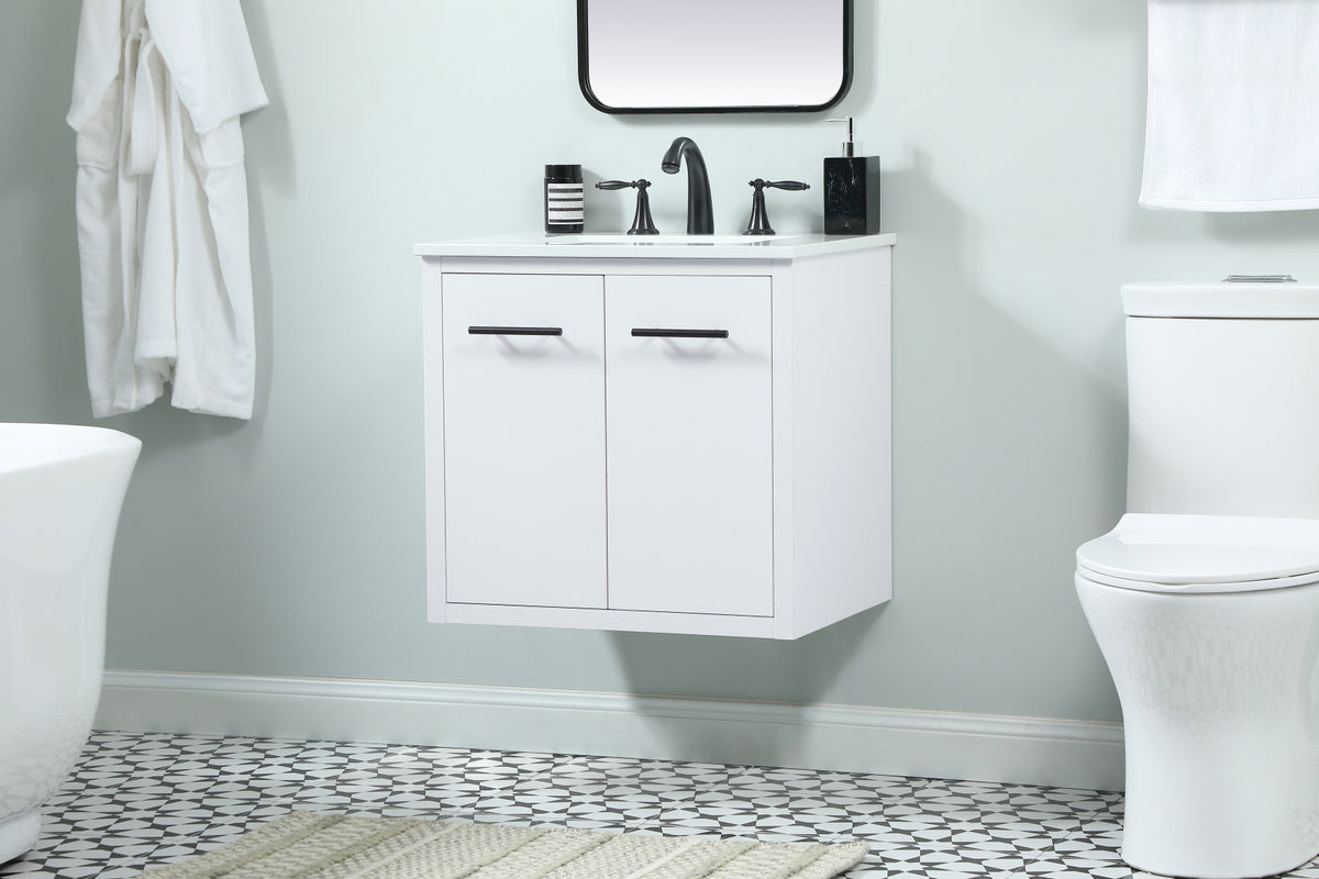 Delve into a world of minimalistic fashion and contemporary styling with this midcentury modern vanity. The clean lines anchors the design, while the straight tapered cylinder legs add subtle interest. Bar pull handle adorns the soft closing door hiding the base of the rectangular porcelain sink and letting you store your bathroom necessities and toiletries. The compact size makes it the perfect vanity for any bathroom or powder room, regardless of size. Whether you want to use this as a floating vanity or a freestanding vanity, the choice is yours. The durable ivory white engineered marble countertop complements the manufactured wood base vanity and is built to last.