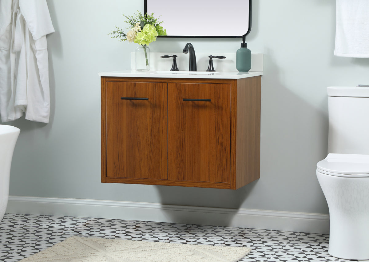 Delve into a world of minimalistic fashion and contemporary styling with this midcentury modern vanity. The clean lines anchors the design, while the straight tapered cylinder legs add subtle interest. Bar pull handle adorns the soft closing door hiding the base of the rectangular porcelain sink and letting you store your bathroom necessities and toiletries. Whether you want to use this as a floating vanity or a freestanding vanity, the choice is yours. The durable ivory white engineered marble countertop complements the manufactured wood base vanity and is built to last. Comes with a matching backsplash to complete the look and protects your wall.