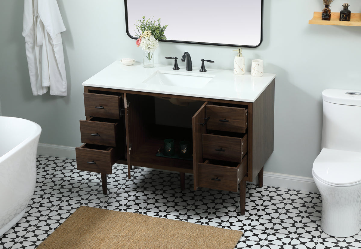 Delve into a world of minimalistic fashion and contemporary styling with this midcentury modern vanity. The clean lines anchors the design, while the straight tapered cylinder legs add subtle interest. Bar pull handle adorns the soft closing door hiding the base of the rectangular porcelain sink and letting you store your bathroom necessities and toiletries. Six soft closing drawers add plenty of storage option. Whether you want to use this as a floating vanity or a freestanding vanity, the choice is yours. The durable ivory white engineered marble countertop complements the manufactured wood base vanity and is built to last.