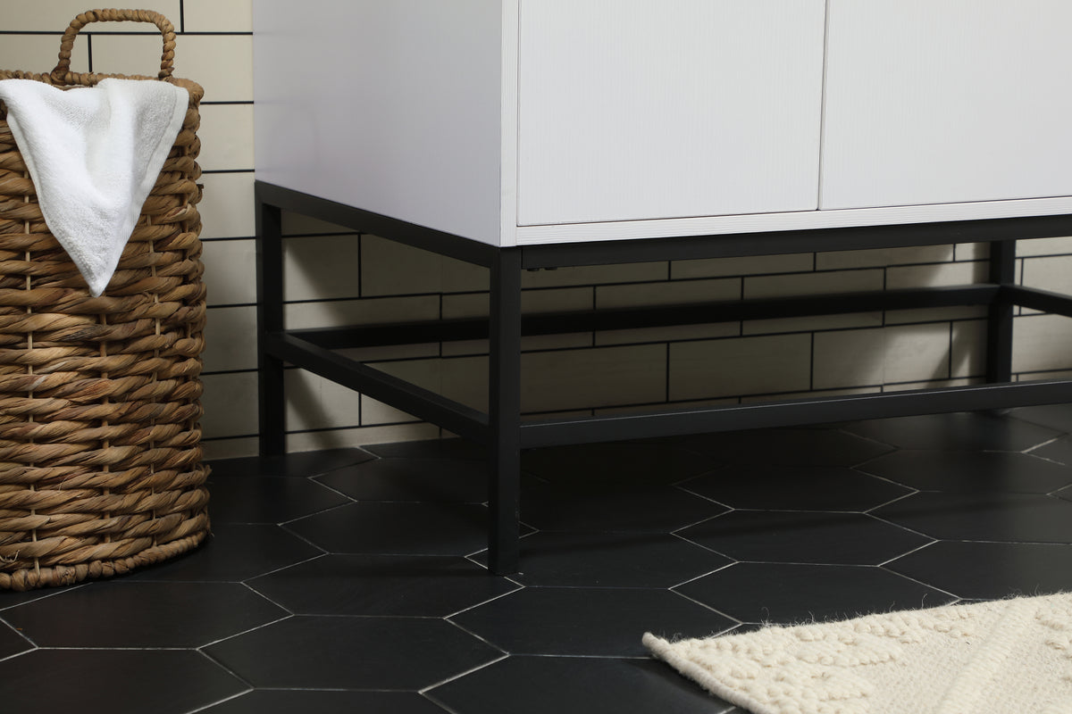 This vanity is a sleek-looking piece of bathroom furniture that is easy to incorporate into your design scheme. The cabinet features a smooth door panel with an oversized steel handle and soft close hinges provide ample room for accessories. Constructed of engineered wood, the powder-coated metal rod legs are an urban industrial look that we love. Minor assembly of the metal legs needed to get this vanity up and running. Comes with a matching backsplash to complete the look and protects your wall.